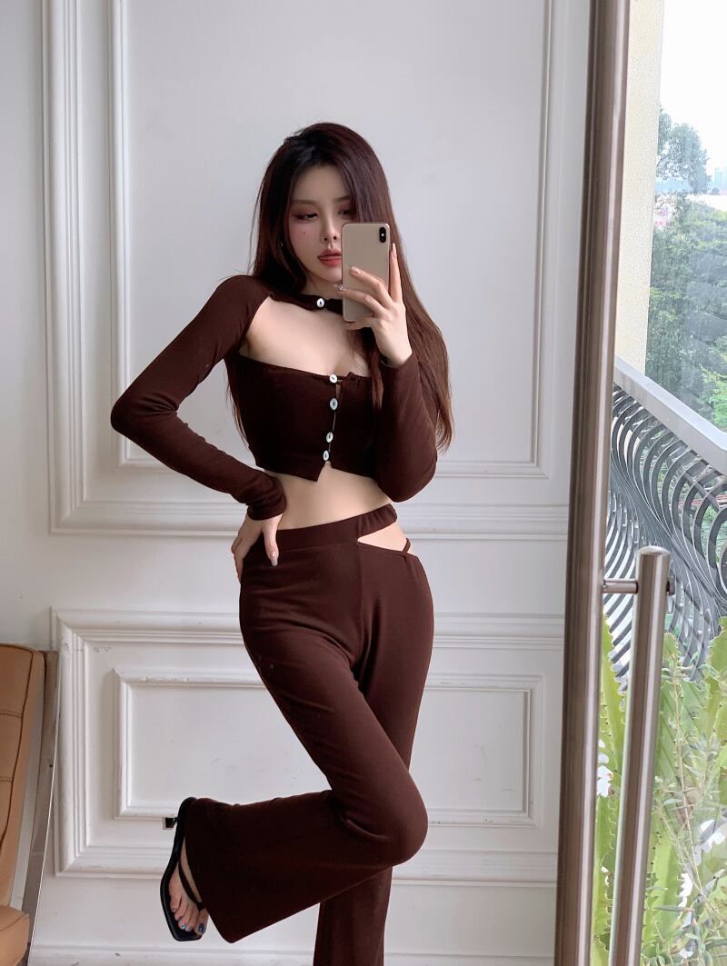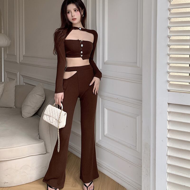 ホットガールズセクシースーツ長袖ショート Tシャツトップ夏ウエストスリムフィットマイクロフレアパンツ 2 点セット ロング サマー 夏物