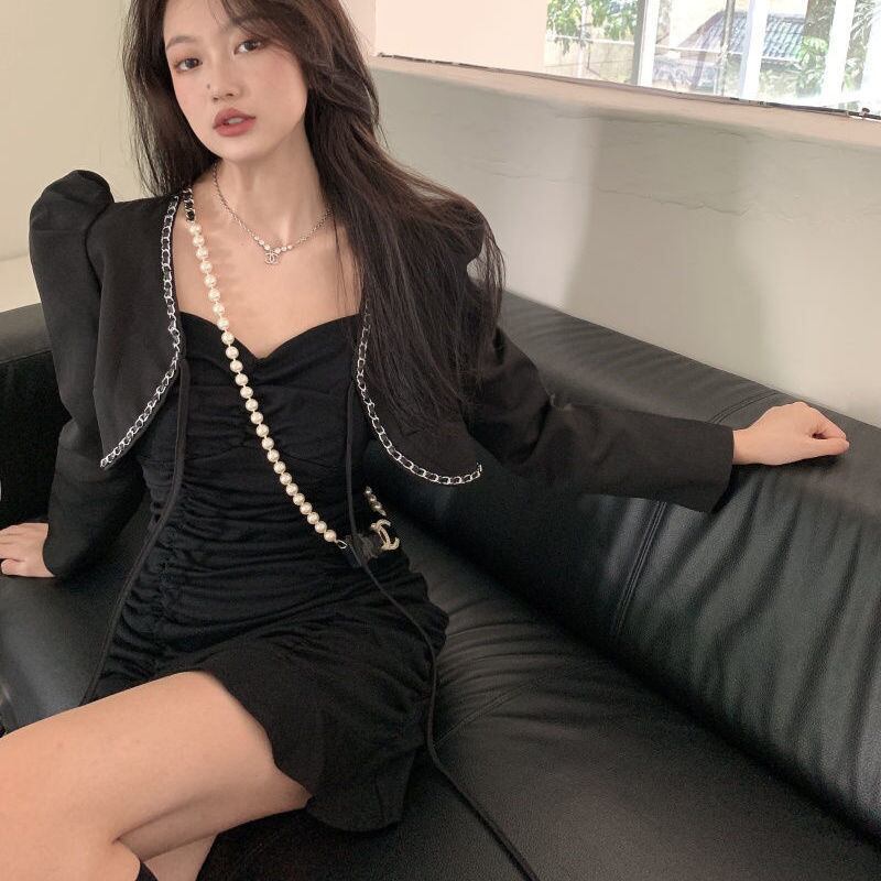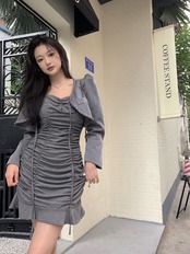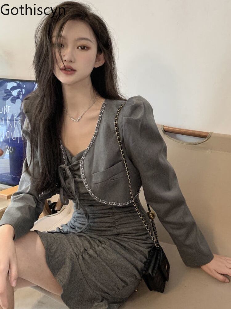 Gothiscyn スリング ドレス カーディガン グレー ブレザー ニッチ フリル ドローストリング プリーツ ヒップ スカート スキニー セクシー 秋 V ネック スリム スカート オータム 秋物 Vネック