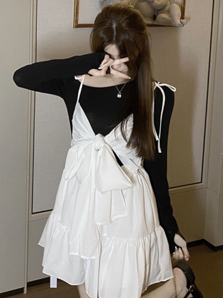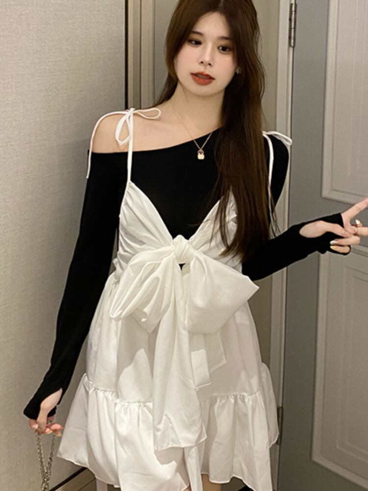 Gothiscyn 夏スーツ弓サスペンダードレス + 日焼け止めトップ斜め肩不規則セット純粋欲望スーツ リボン サマー 夏物 ピュア