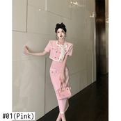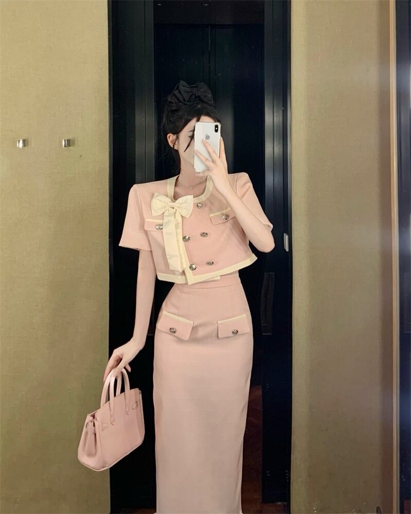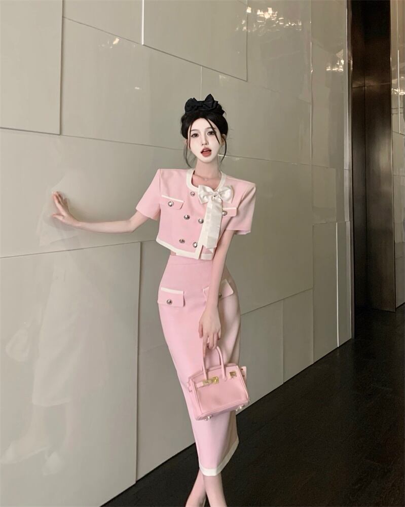 スウィートガールスーツレディース半袖コントラストボウコートウエストバックスプリットスカートツーピースセット服 リボン 大人ガーリー キュート カジュアル