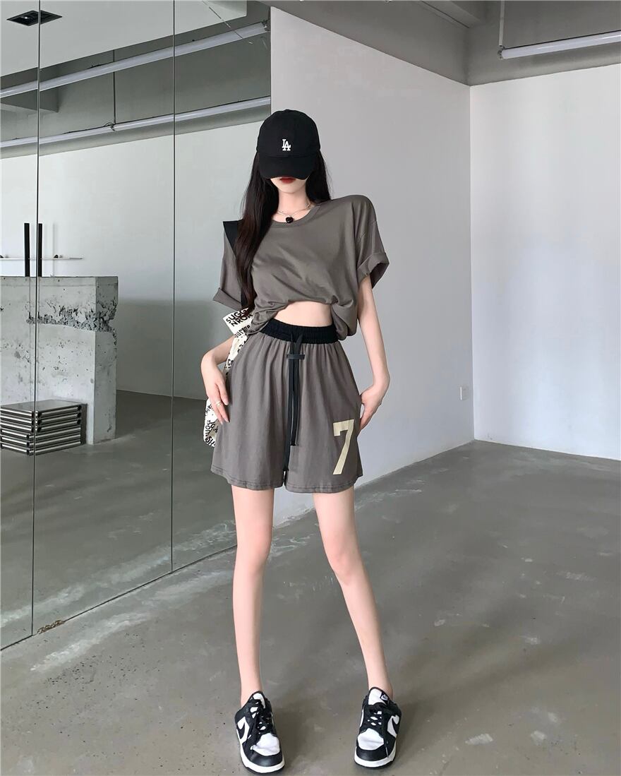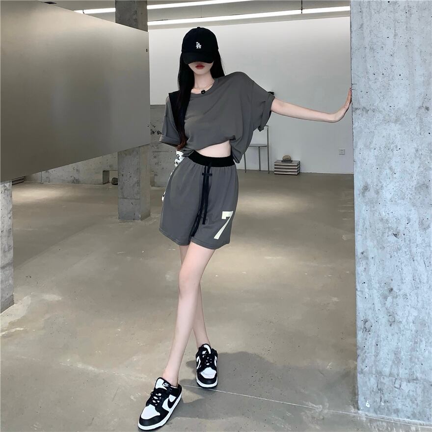 Gothiscyn 黒スーツ夏ルーズトップ半袖 Tシャツホットガールウエストショーツ 2 点セットストリートスーツ ブラック ハーフスリーブ サマー 夏物 ブルマー