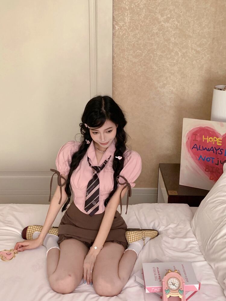 夏プレッピースタイルスーツピンク半袖スリムシャツトップウエストストラップドレスツーピースセット服 サマー 夏物