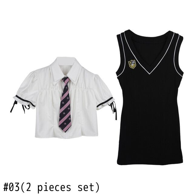 Gothiscyn スタイル ツーピース ドレス スーツ夏気質半袖クロップド シャツ + ネクタイ + ニット ベスト ドレス ショート ハーフスリーブ サマー 夏物