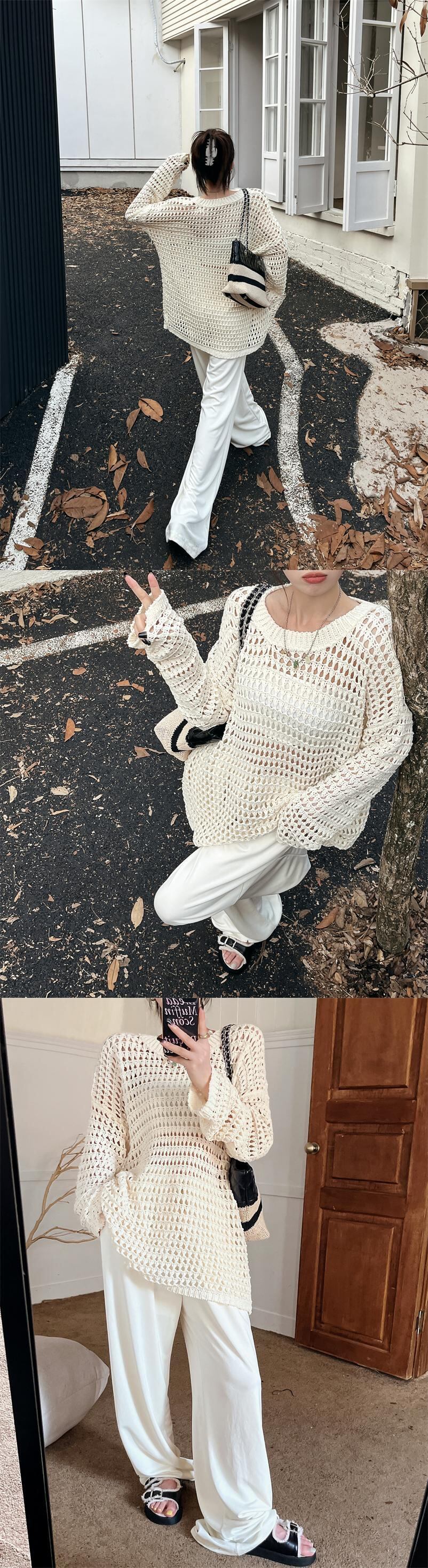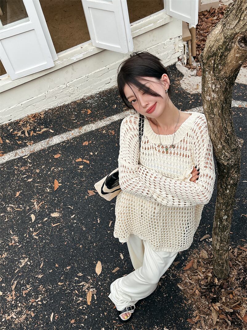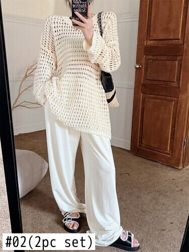 ツーピースセットレディース衣装中空ルーズ無地セーター長ズボン梨花服秋/冬 2pc セット ロング オータム 秋物 ウィンター 冬物 ソリッドカラー