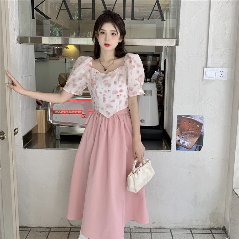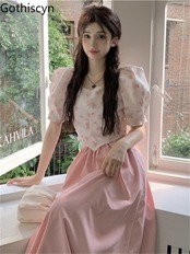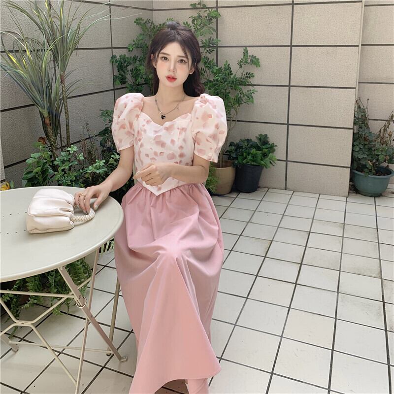 Gothiscyn ツーピーススーツブラウススカート夏花柄半袖トップスミドル丈スカート甘い衣装 大人ガーリー スウィート キュート カジュアル サマー 夏物