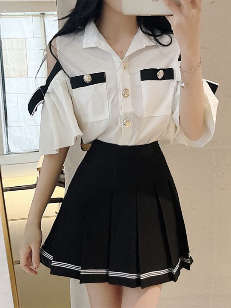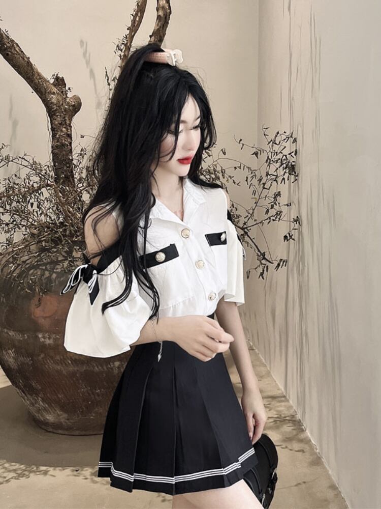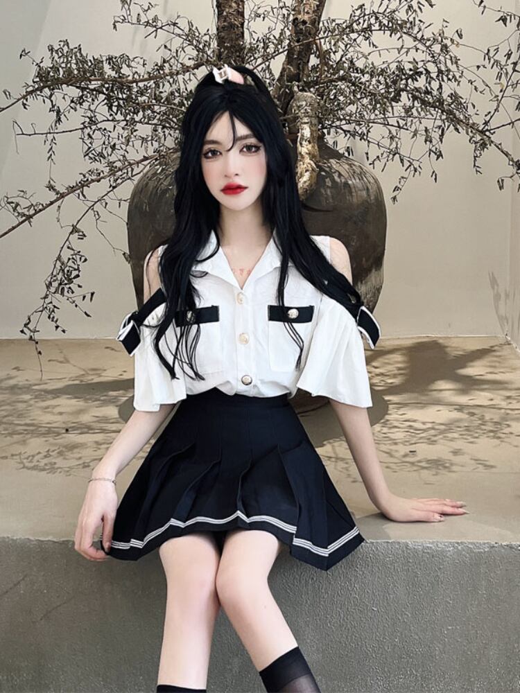 Gothiscyn スーツスカートセット 2 個オフショルダーシャツパフスリーブ黒プリーツスカートセクシー衣装夏 ブラック サマー 夏物