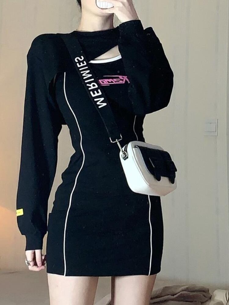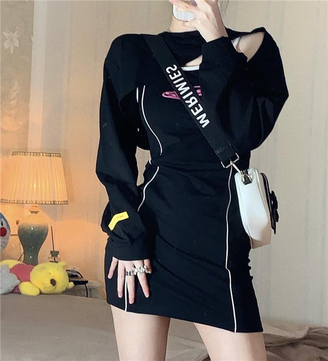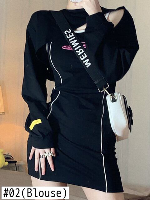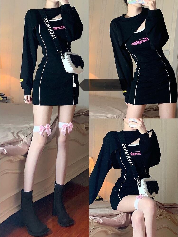 gothiscyn ツーピース スーツ ホット ガール レター プリント スリム フィット スリム ブラック スリング スカート + 中空 薄い 日焼け止め オーバーコート プレッピー スタイル