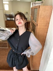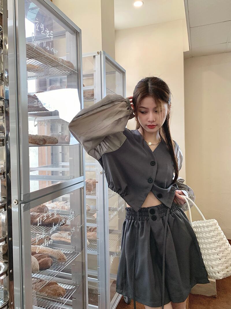 Gothiscyn スーツシャツ長袖ランタンスリーブトップスブラウス夏ワイドレッグショーツ 2 点セットオフィスレディ ロング サマー 夏物 ブルマー ワイドパンツ 会社 学校 通勤や通学にも