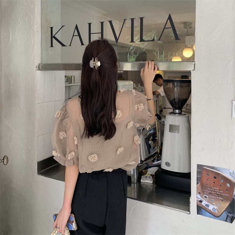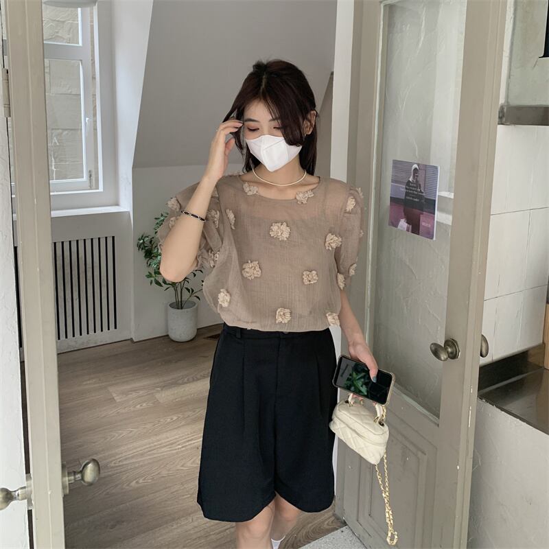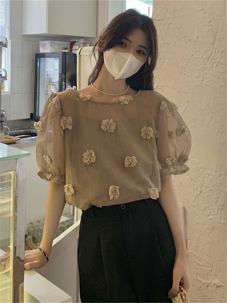 Gothiscyn レディース ブラウス プルオーバー メッシュ レトロ フラワー パフスリーブ シャツ 夏 ゆったり ショート 半袖 サマー 夏物 フラワーデザイン