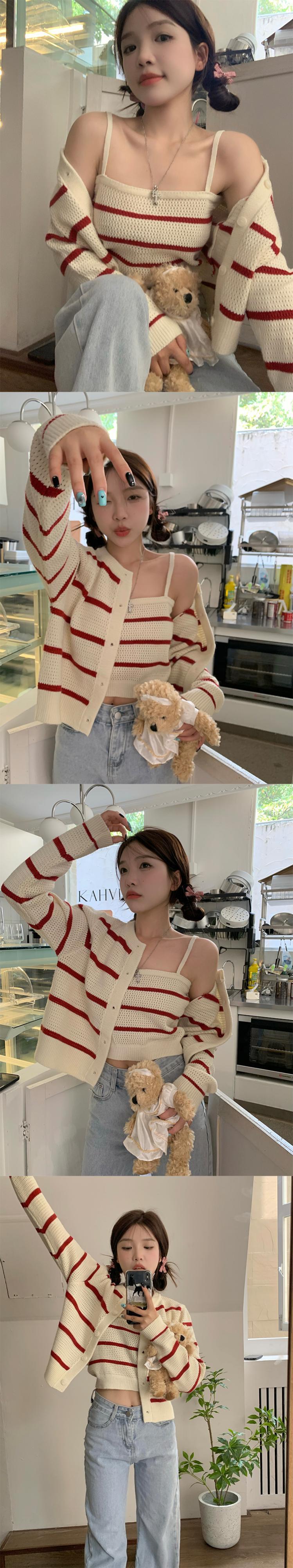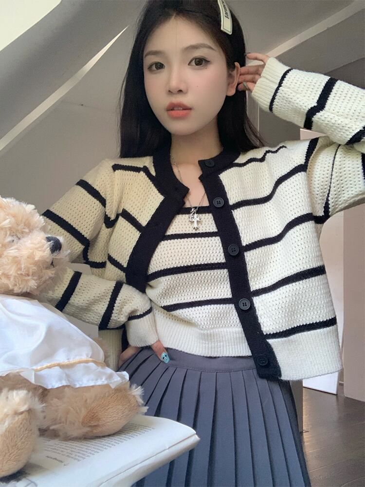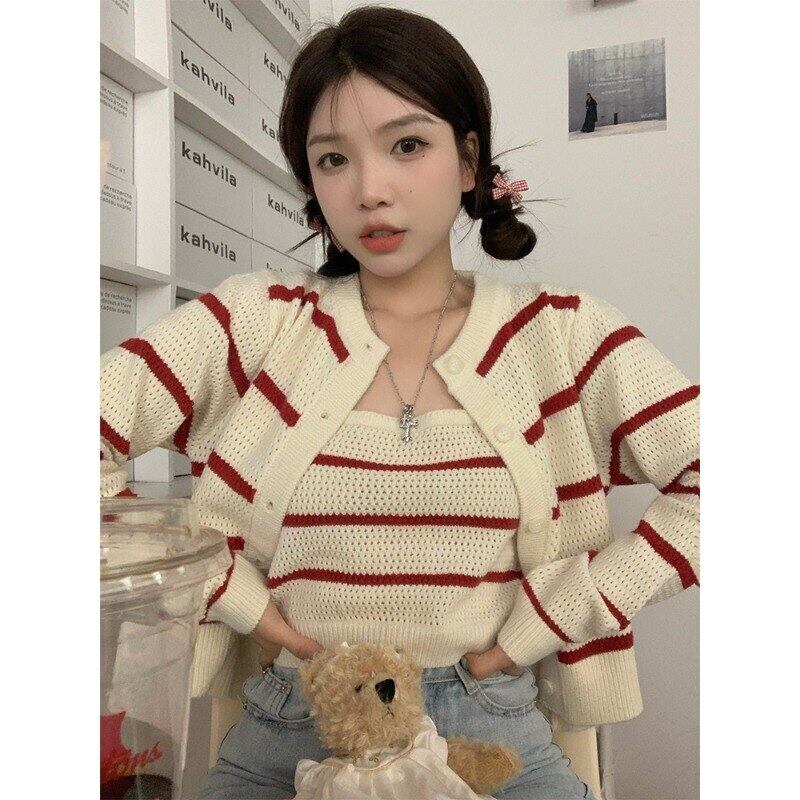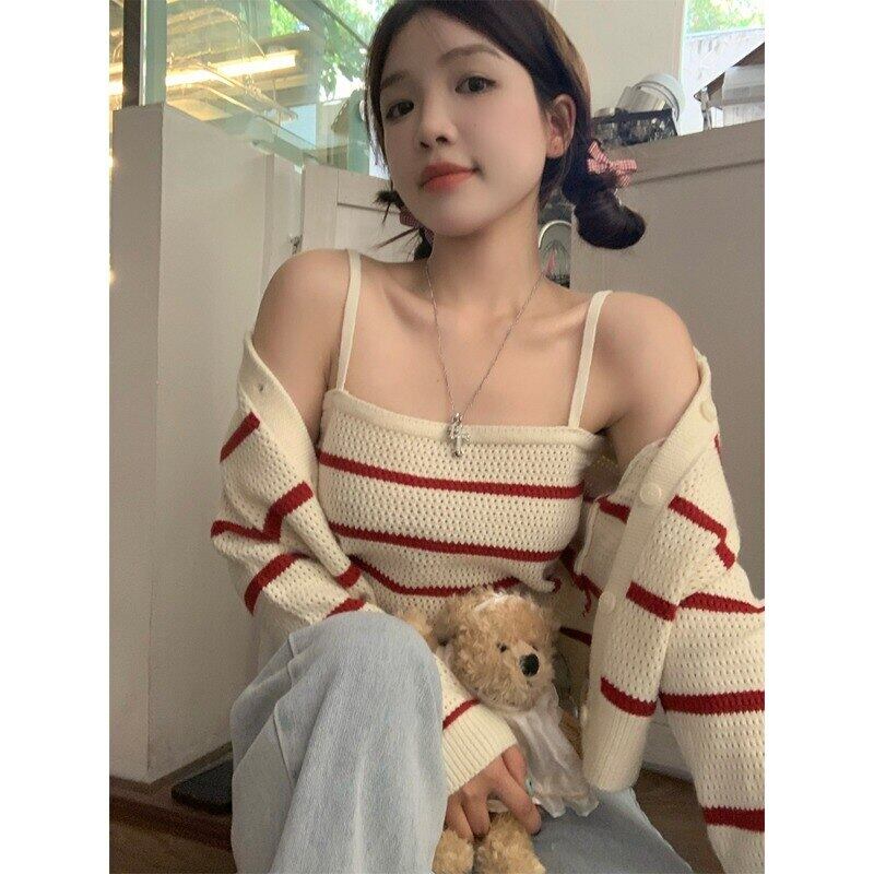 ストライプセーターカーディガン秋ショートルーズアウターウェアニットカーディガンコートトップサスペンダー 2 点セット オータム 秋物