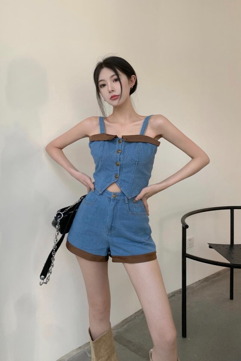 ホットガールサマースーツストラップ色トップウエストスリム A ラインデニムショーツ 2 点セット服 レッド 夏物 ブルマー Aライン