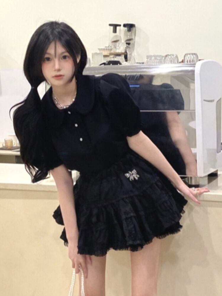 Gothiscyn ブラック スーツ スカート ブラウス トップ パフ スリーブ ショート スカート ツー ピース サマー スーツ シックカップケーキ ドレス 夏物
