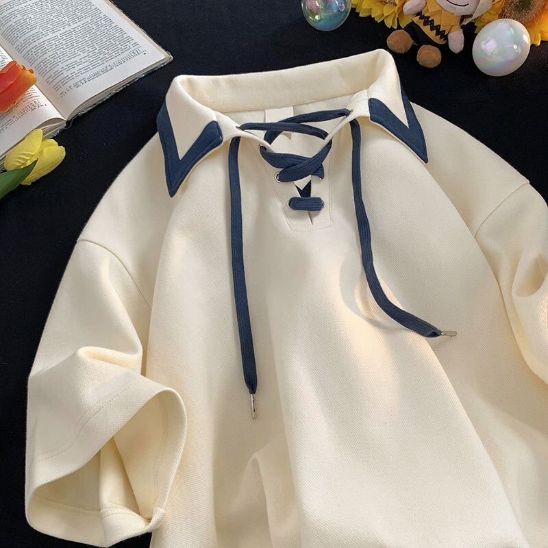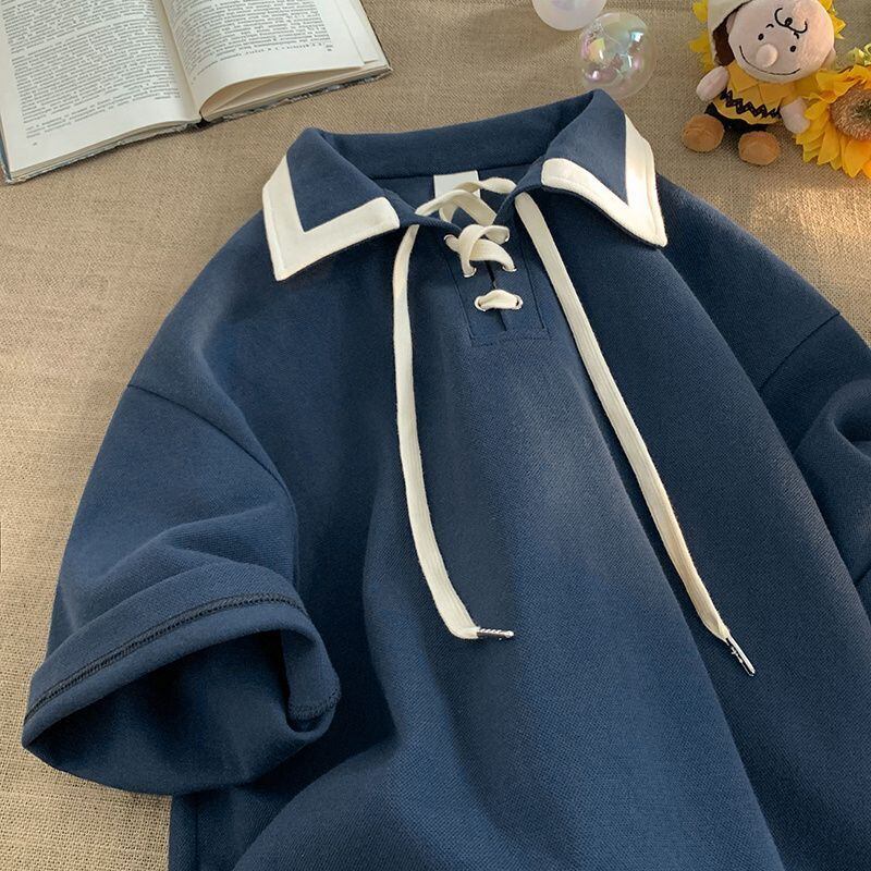 アメリカンターンダウンカラー半袖Tシャツレディースサマーアカデミックスタイルルーズトップ服 夏物