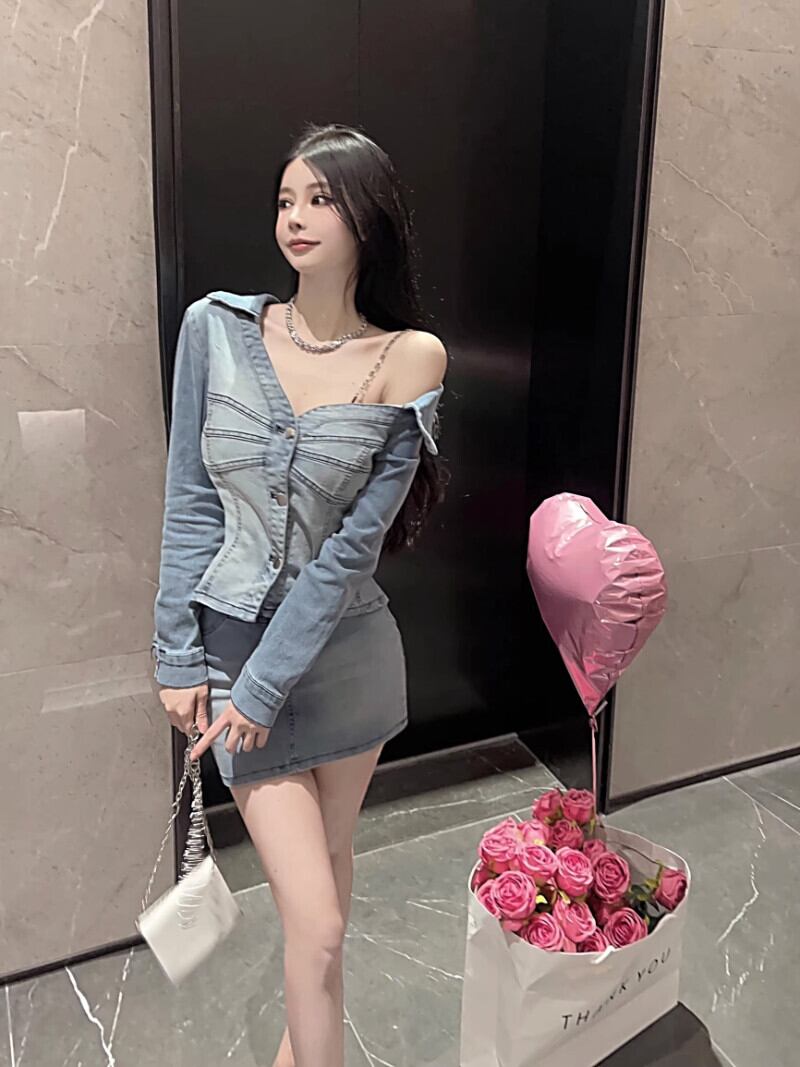 熱い女子春スーツ香港スタイル洗浄古いオフショルダートップラップヒップスカート徳民ツーピースセット スプリング 春物