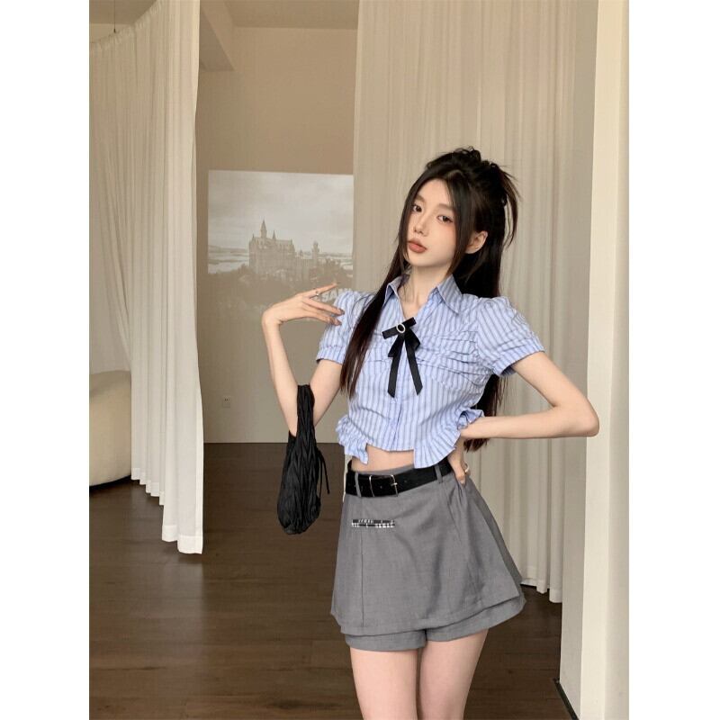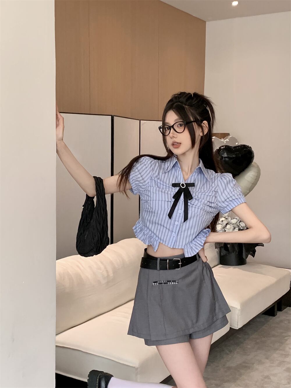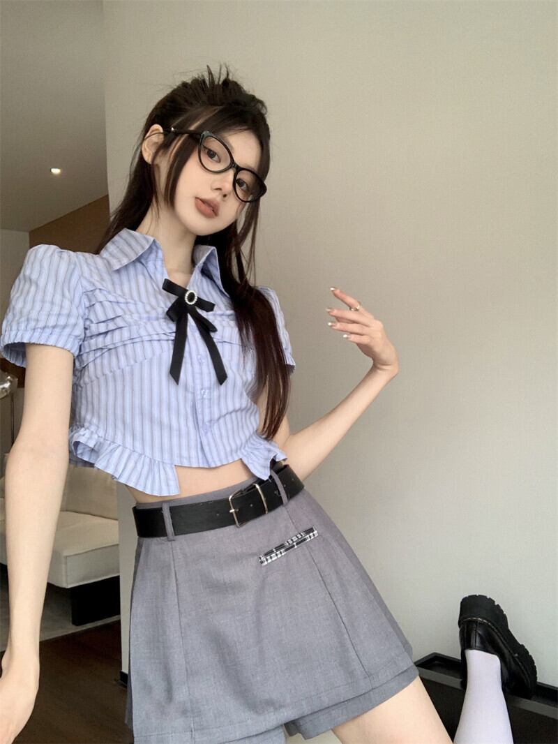 スタイルスーツ ボウプリーツ半袖シャツ ウエストスリムプリーツスカート ツーピースセット服 リボン