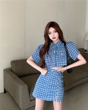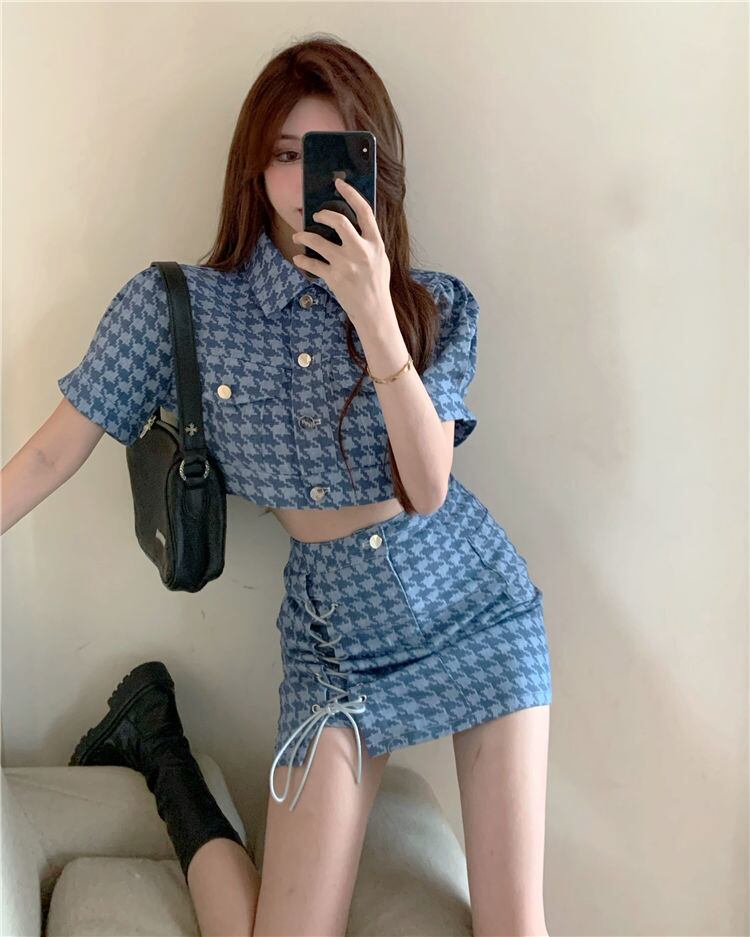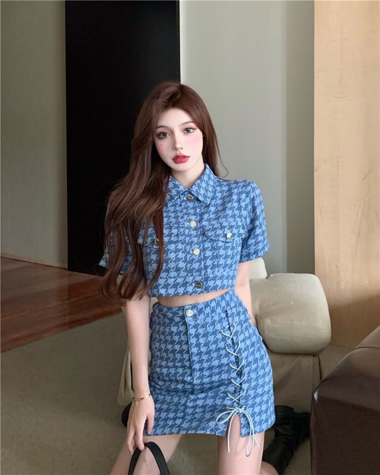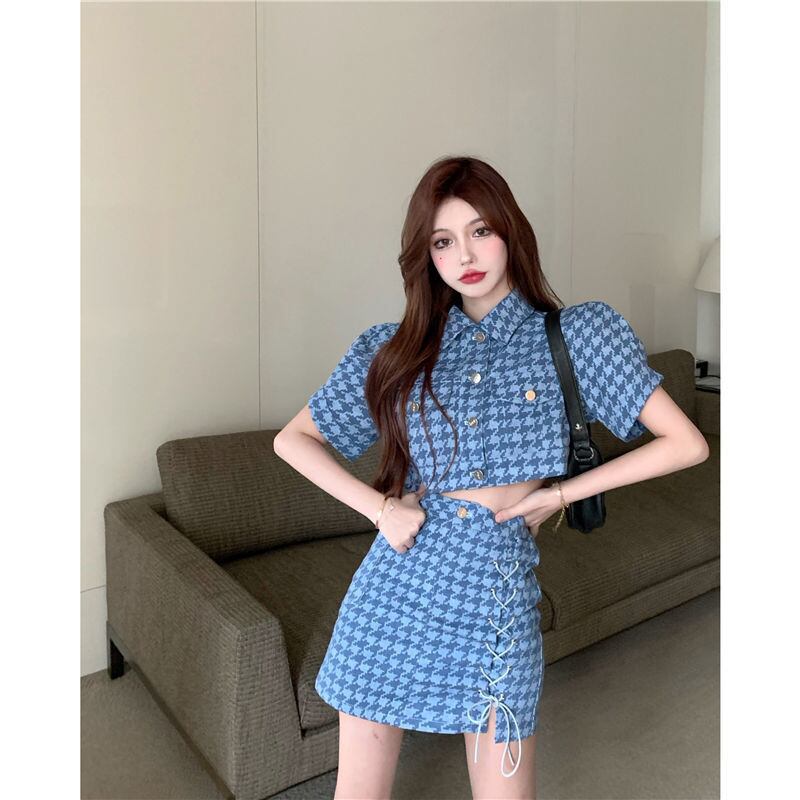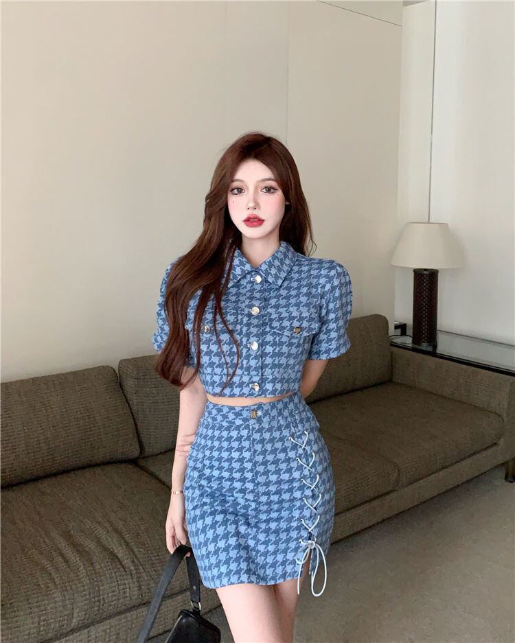 Gothiscyn 2ピース スーツ 半袖 クロップ トップ ブルー レトロ 千鳥格子 ショート トップ + スカート サイド スリット ホット ガール シック