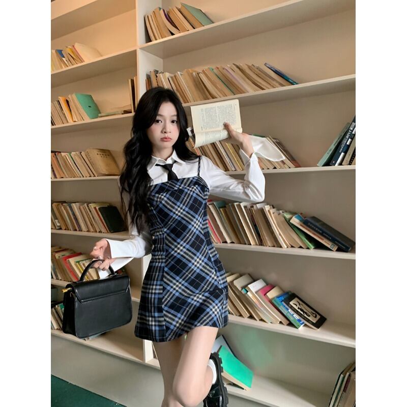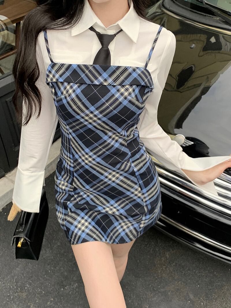 ホットガールスタイルスーツ白シャツ甘いスリムフィットチェック柄サスペンダーショートドレスツーピースセット服 ホワイト 大人ガーリー スウィート キュート カジュアル