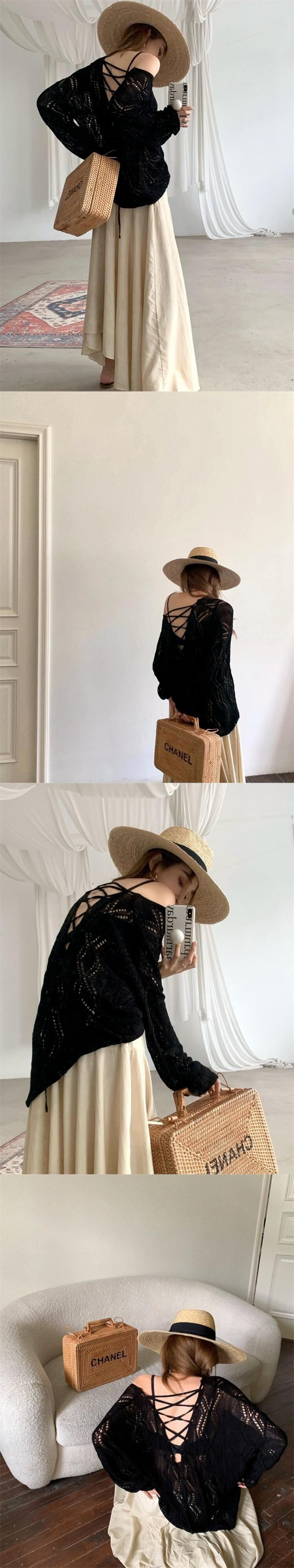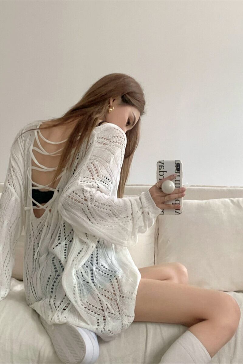 ホワイトスリム長袖日焼け止めセータープルオーバーブラウス夏中空緩いオープンバックトップシャツ ロング サマー 夏物