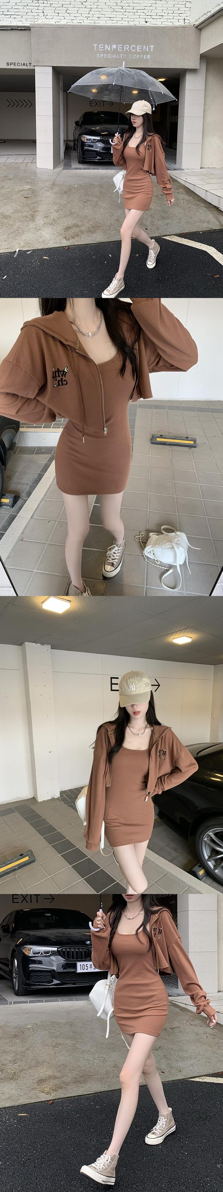 ツーピースセットレディース衣装ショートルーズフード付きロングスリーブカーディガンコートホットガールウエストストラップドレス梨花服秋セット 長袖 オータム 秋物
