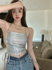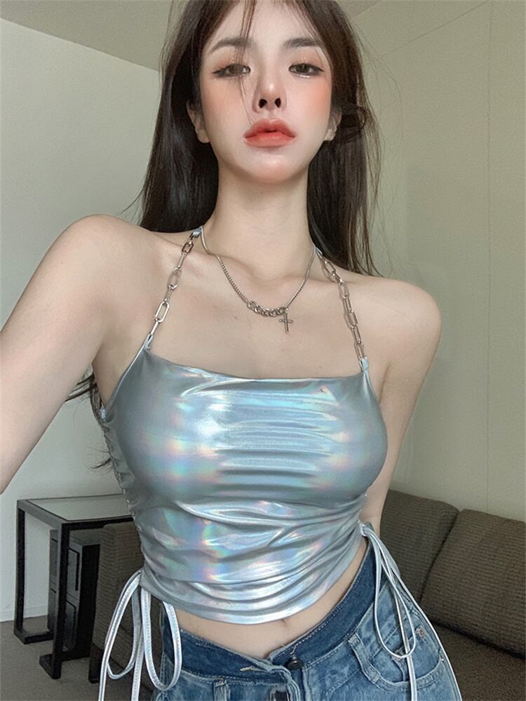 Gothiscyn チェーンホルターネックタンクキャミスリムサイド巾着 Pu キャミソールホットガールサマーベスト Y2k クロップトップコルセットノースリーブ 夏物