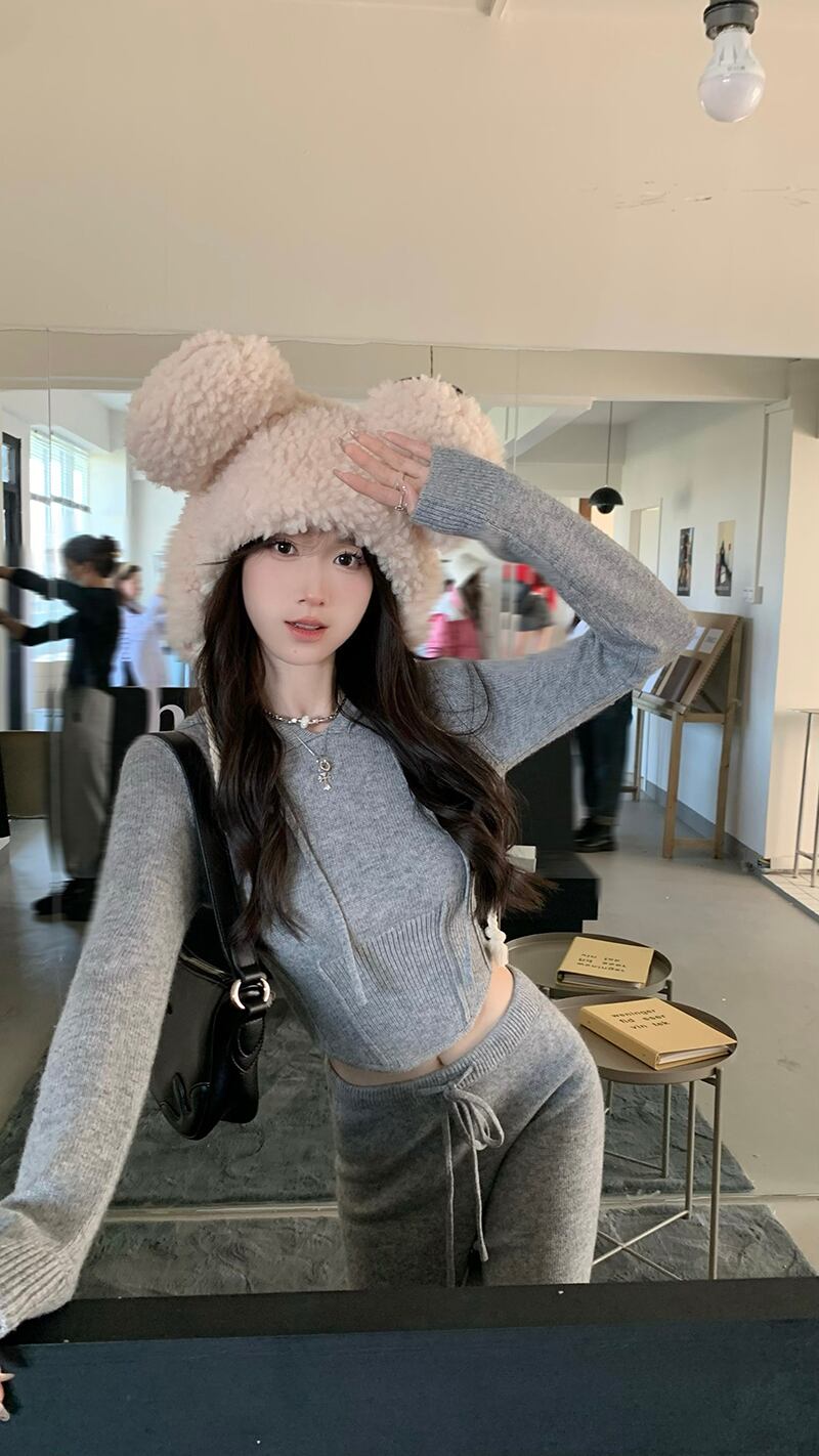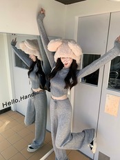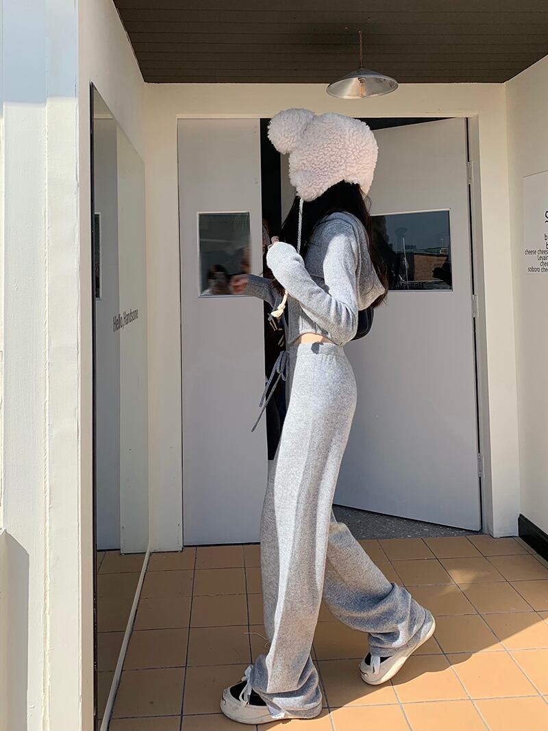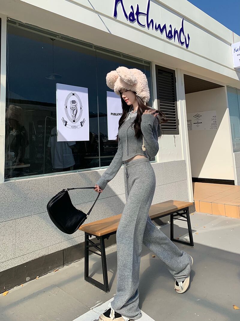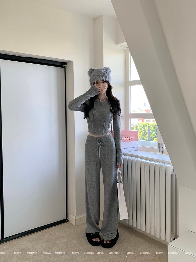 秋と冬ニットツーピーススーツフード付きショートトップウエストレースアップワイドレッグフロアパンツ服 オータム 秋物 ウィンター 冬物 ワイドパンツ