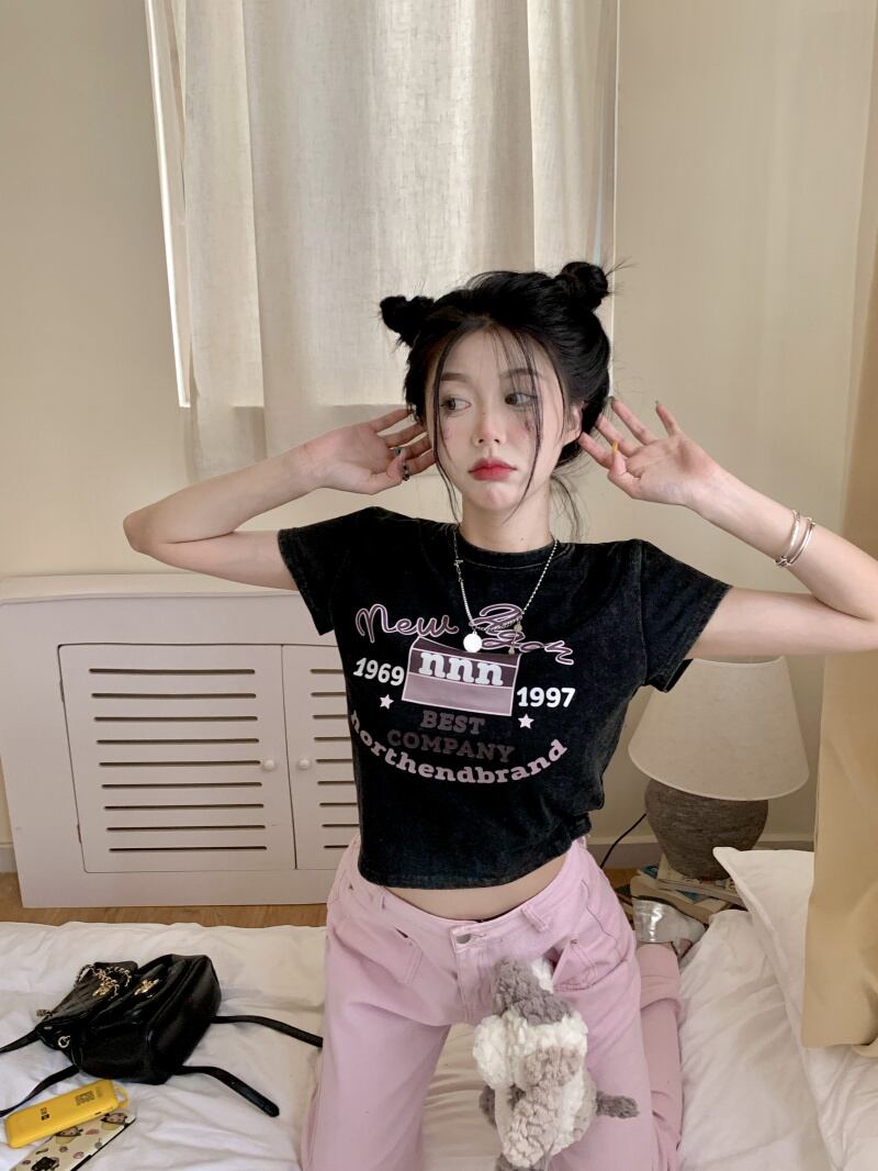 Gothiscyn ホットガール黒 Tシャツ夏アメリカンレトロ半袖トップ Y2k Tシャツ原宿ゴス服 ショート ブラック ハーフスリーブ かわいい サマー 夏物