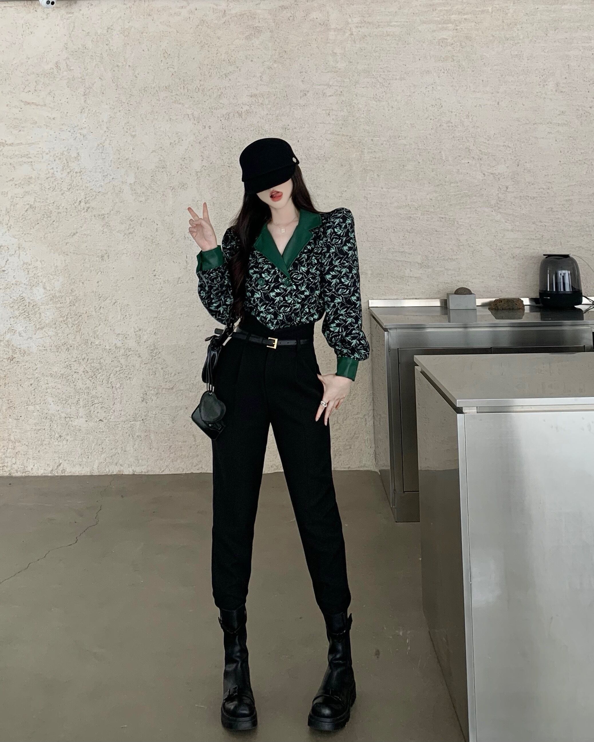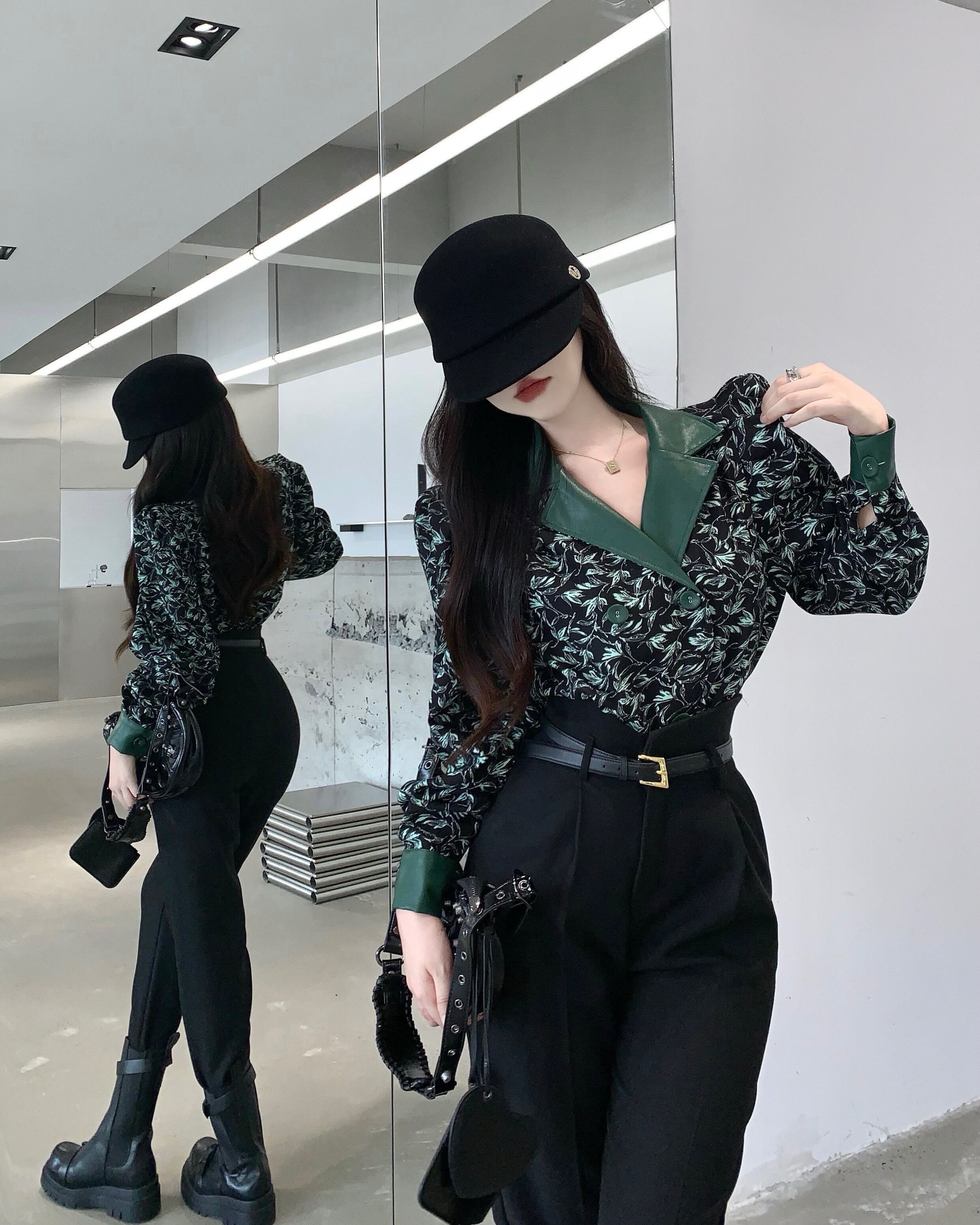 長袖 ターンダウンカラー コントラストカラー レトロ花柄 シャツ ウエスト ハルンパンツ レディース 2点セット ロング