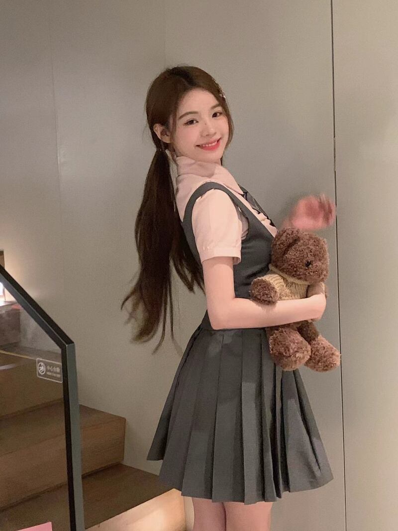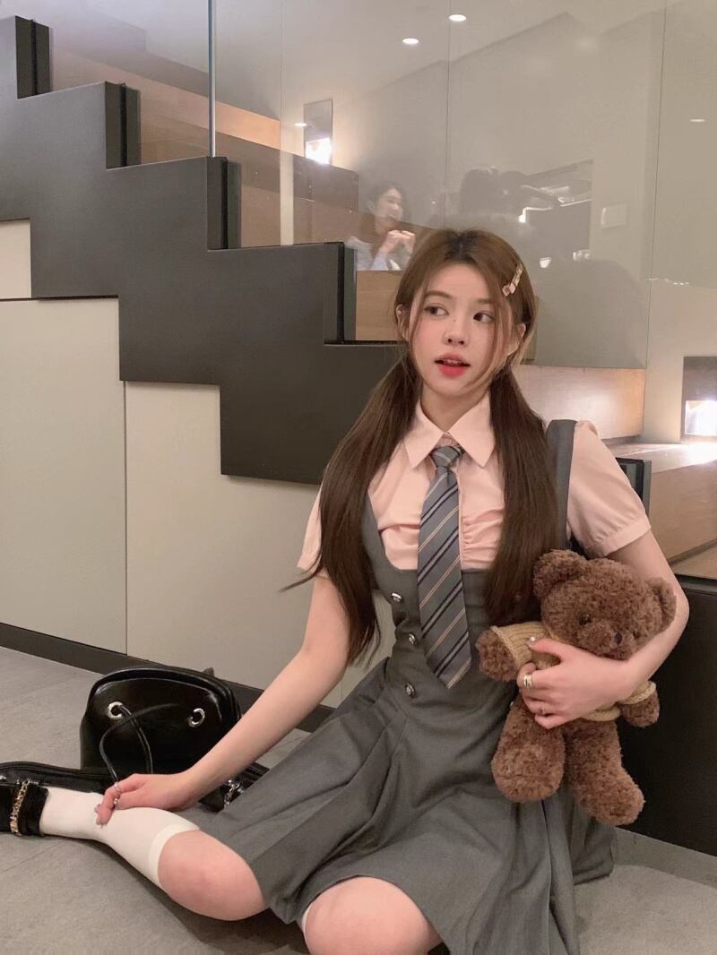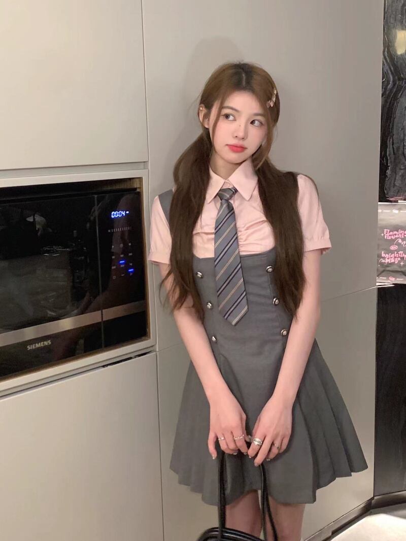 ピンク プレッピー スタイル スーツスリム フィット アメリカン タンク ドレス半袖ターン ダウン襟シャツ 2 点セット服