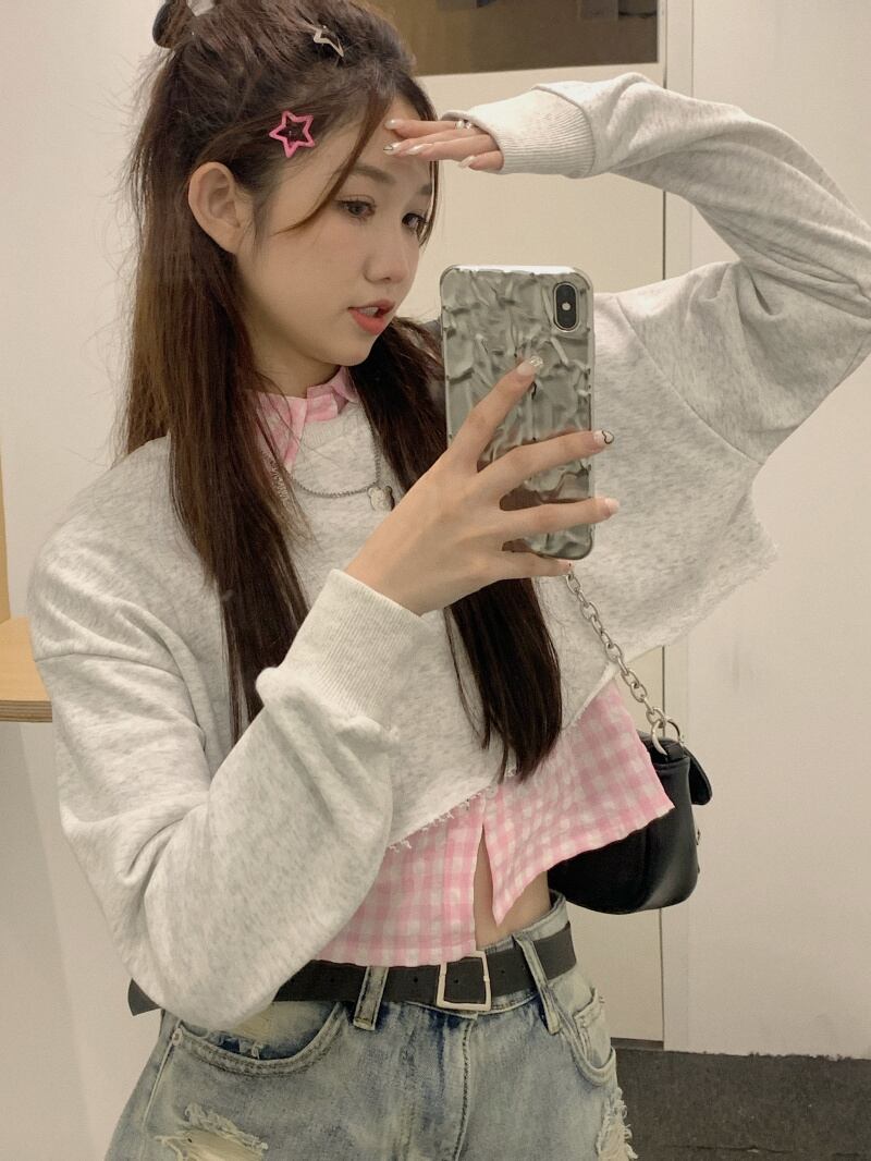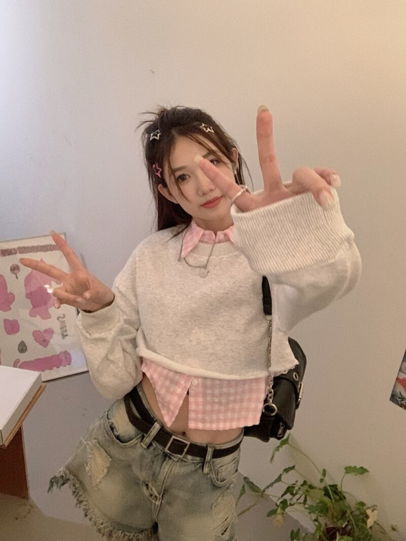 冬服長袖ターンダウン襟セーターチェック柄ルーススウェットピンクパッチワークプルオーバー服ショートトップス ロング シャツ ウィンター 冬物