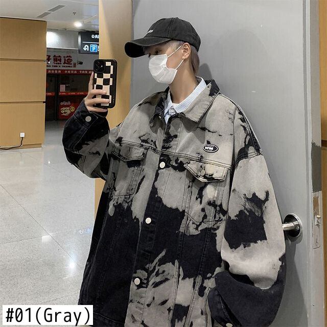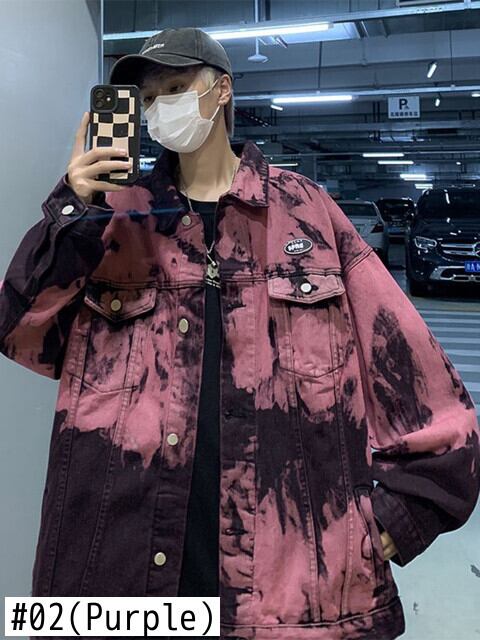 アメリカン ヒップホップ カラー タイダイ ポロ デニム ジャケット メンズ 春と秋 ルーズ ウォッシュド オールド ジャケット 服 レッド スプリング 春物 オータム 秋物