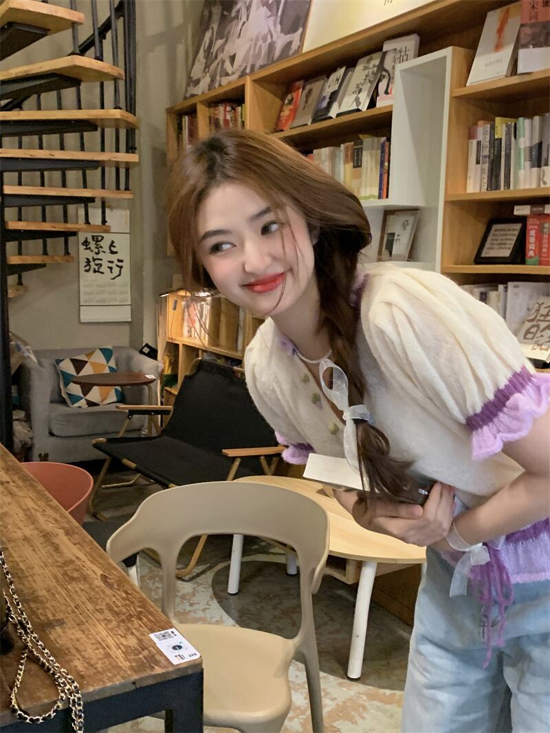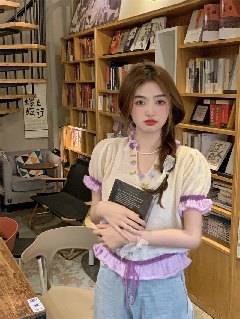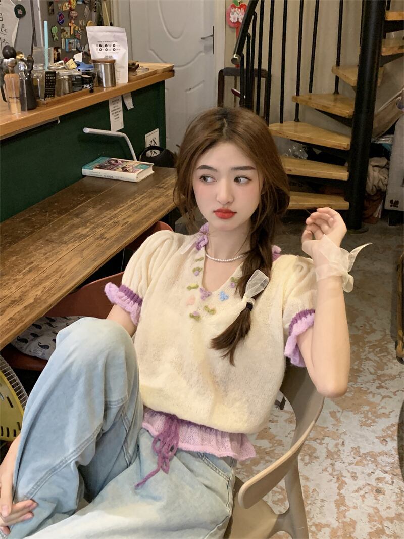 スタイルスウィートガールセーター 3D フラワー V ネック Waveselvedge コントラストバブルスリーブ Tシャツ服 大人ガーリー キュート カジュアル Vネック フラワーデザイン