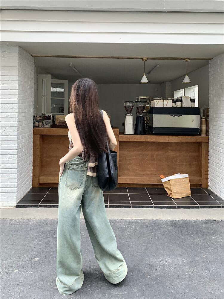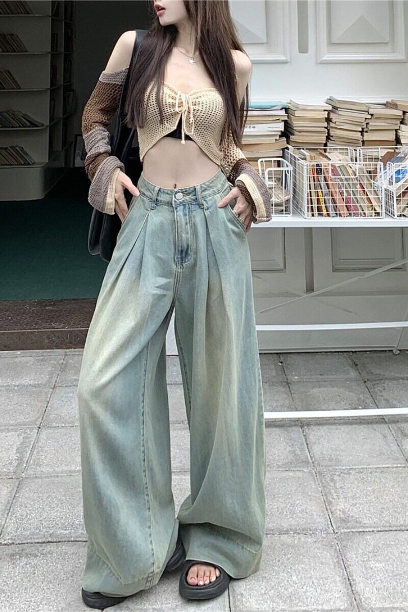 ホットガール怠惰レトロジーンズ春ライトウエストルーズワイド脚床ドラッグパンツ服 スプリング 春物 ワイドレッグ ワイドパンツ
