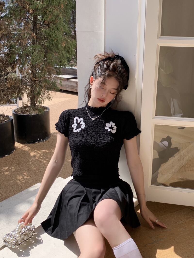 Sweet Girl スーツ レディース 立体 花プリーツ 花びら襟 半袖 トップス 万能 プリーツスカート 2点セット ショート ハーフスリーブ 大人ガーリー スウィート キュート カジュアル フラワーデザイン