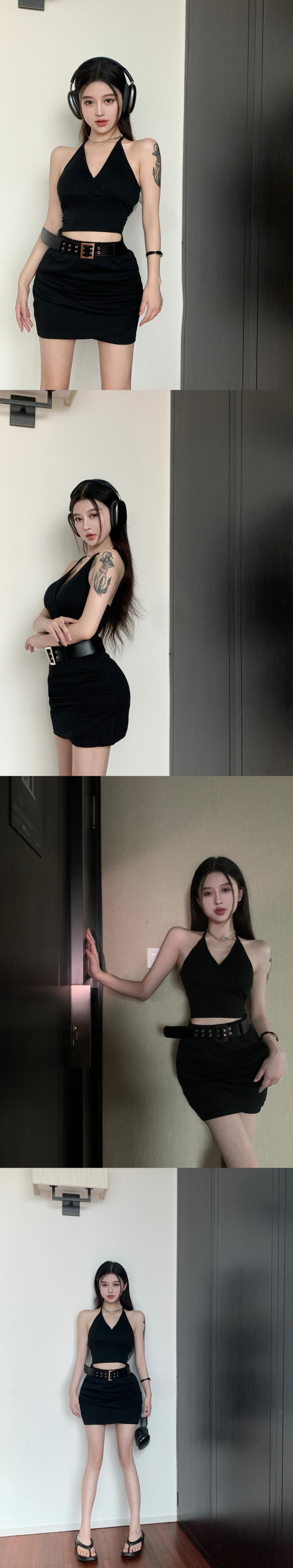 スパイシーガールズスーツ V ネックホルターネックストラップタンクトップウエストスリムラップヒップスカート 2 点セット服 Vネック