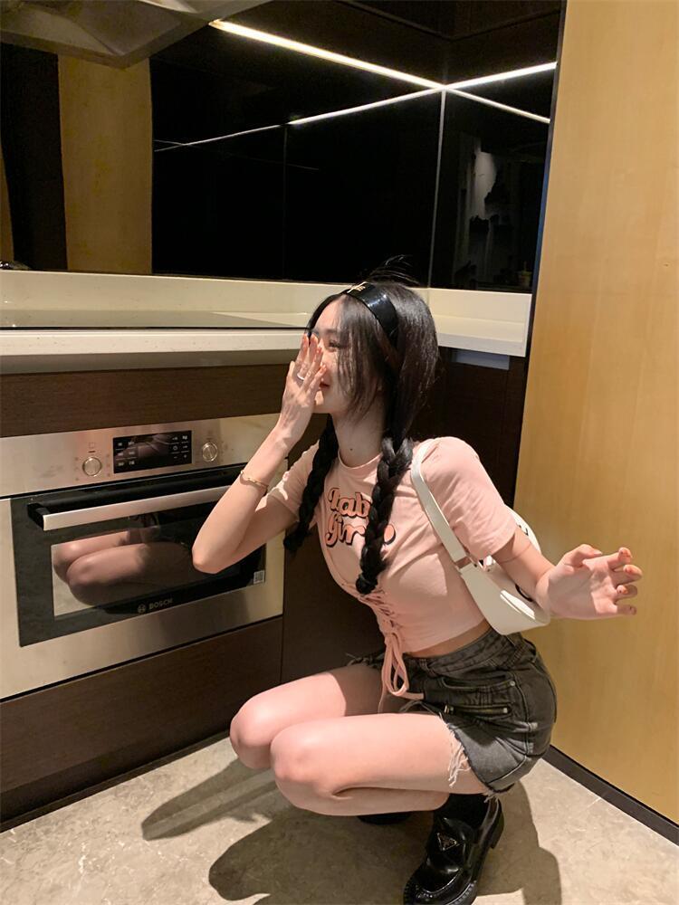 GothiscynLady Tシャツ ショート スリム 半袖 Oネック レター サマードレス 学生 アメリカン スウィート ホット ストラップ ネーブル クロップトップ ハーフスリーブ 大人ガーリー キュート カジュアル 夏物