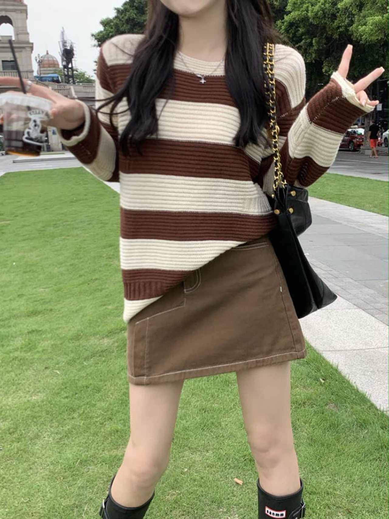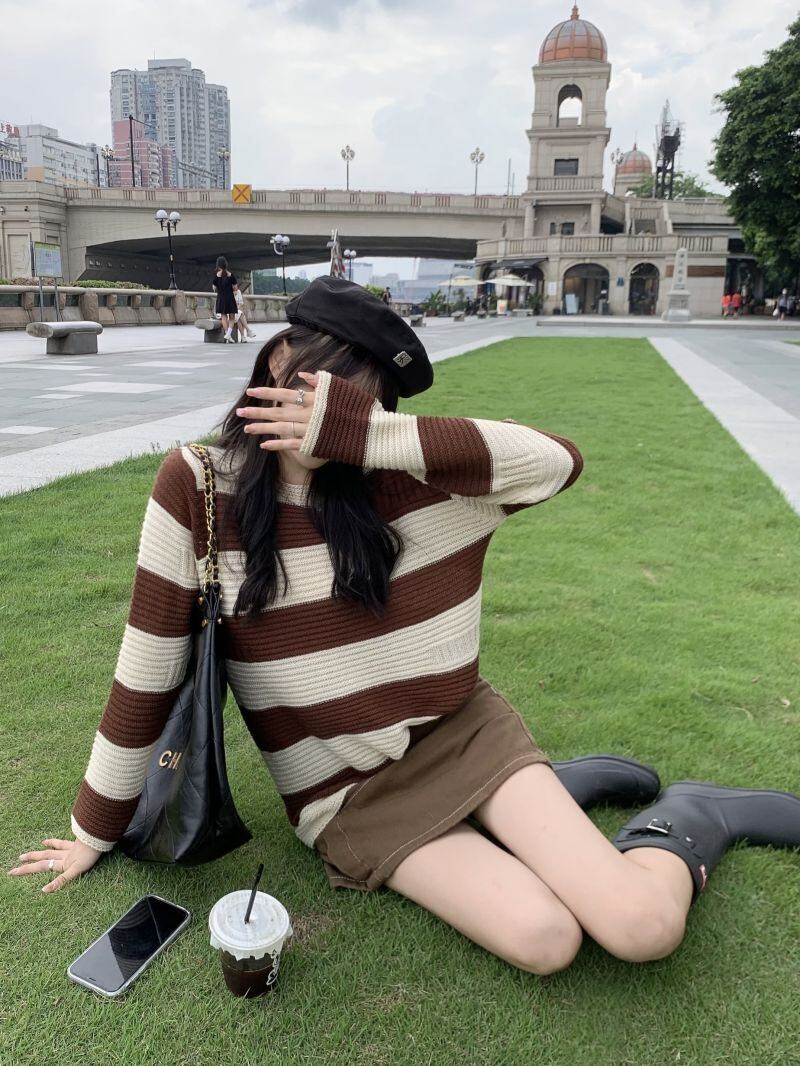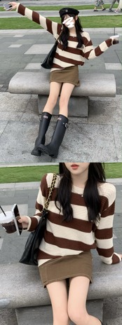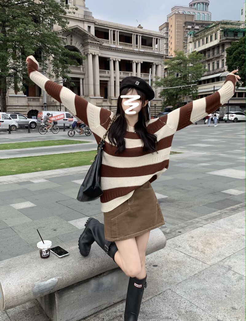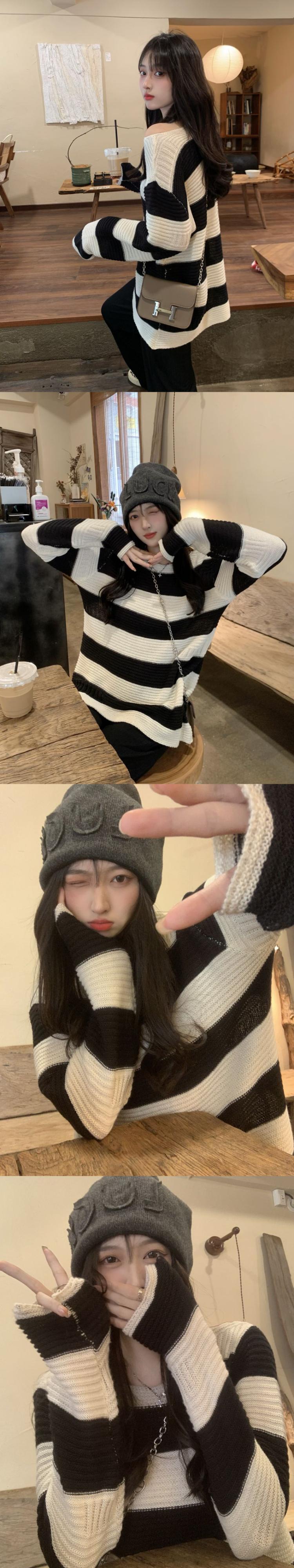 オーバーサイズ セーター ストライプ O ネック 長袖 セーター ルーズ フィット トップス プルオーバー 秋/冬 レディース服 ロング オータム 秋物 ウィンター 冬物 Oネック
