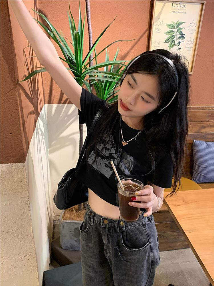 Tシャツ薄型ストレートショルダーレトロ O ネック半袖 Tシャツトップレディースホットガールズプレッピー Tシャツ ショート ハーフスリーブ Oネック