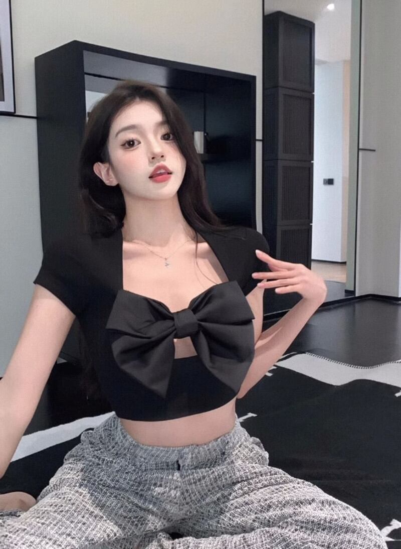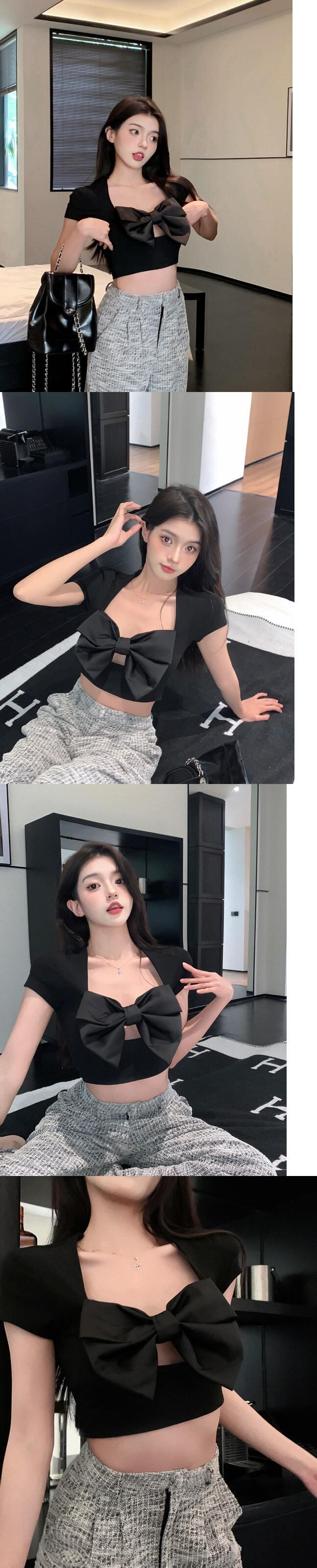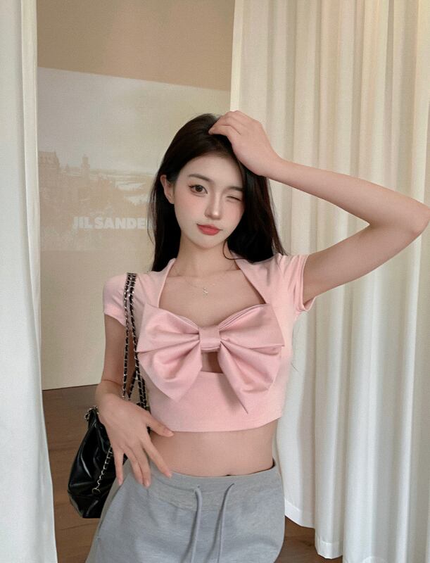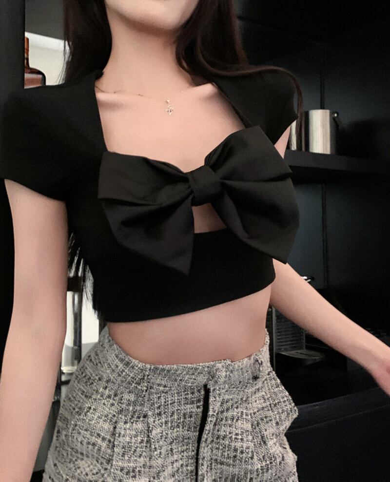 ホットガール中空アウトスクエアカラー弓半袖 Tシャツ夏純粋セクシースリムフィットショートトップ服 リボン サマー 夏物 ピュア スクウェア