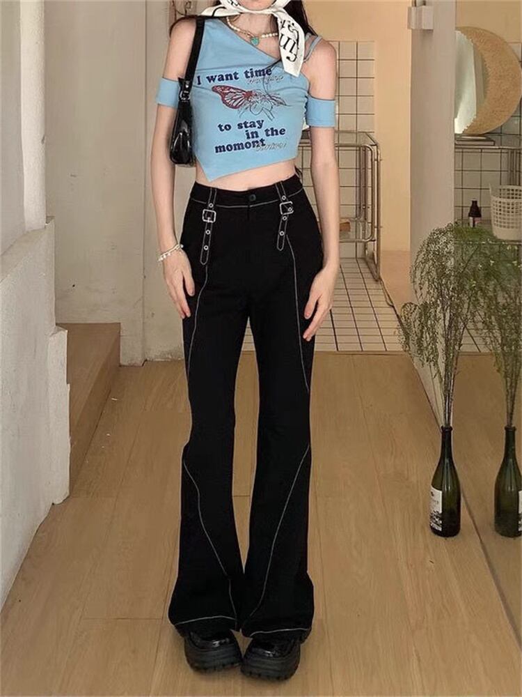 Gothiscyn セクシー女子ブルー不規則 Tシャツ斜めネック印刷スリムショート Tシャツ甘い半袖トップ Y2k Tシャツ ハーフスリーブ 大人ガーリー スウィート キュート カジュアル