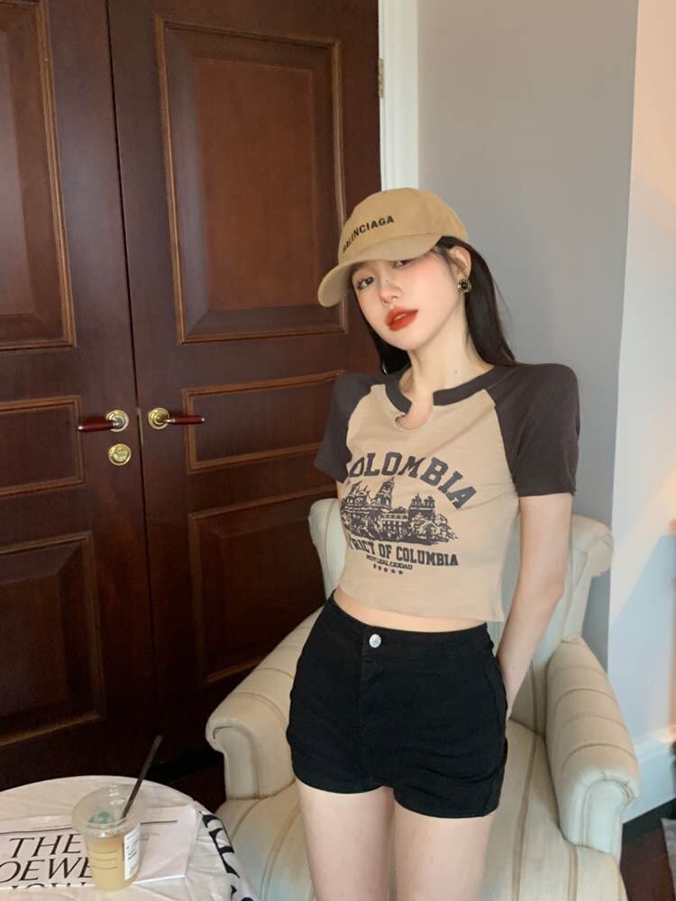 レトロ Tシャツ薄型 O ネック半袖 Tシャツレタープリントトップスレディーススリムホットガールプレッピー Tシャツ ショート ハーフスリーブ Oネック