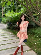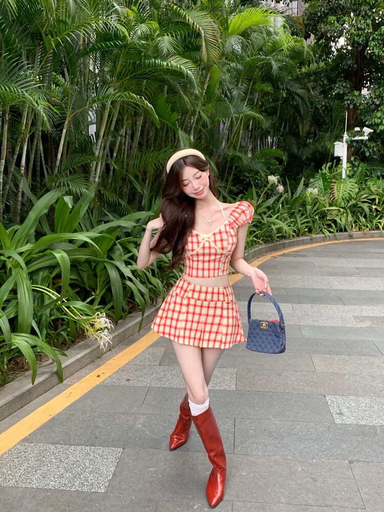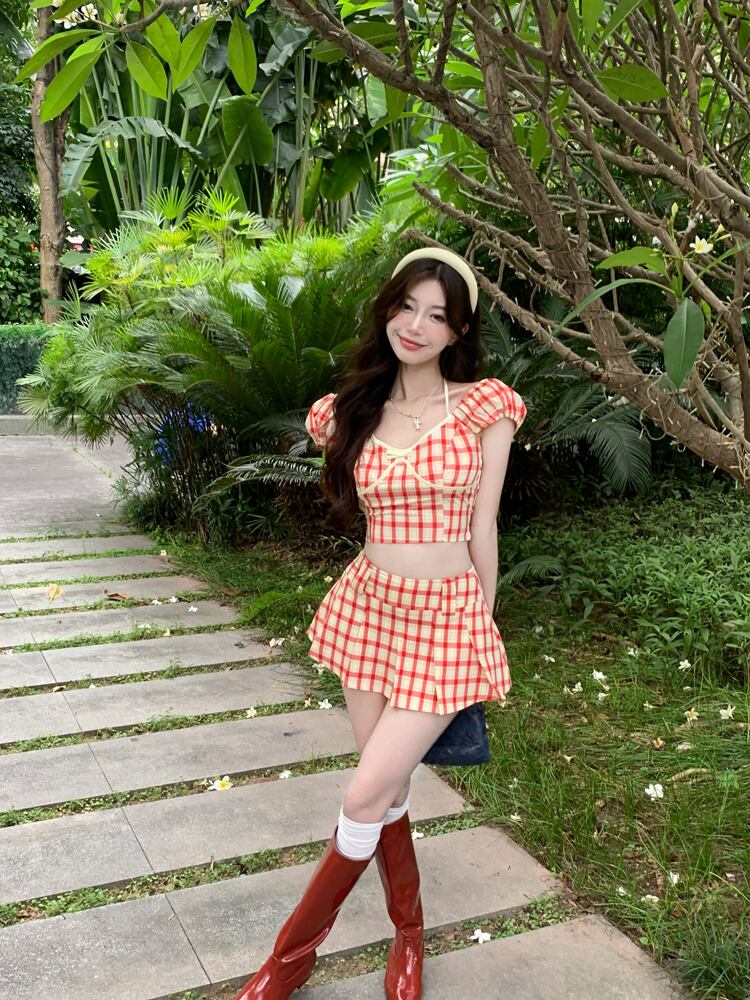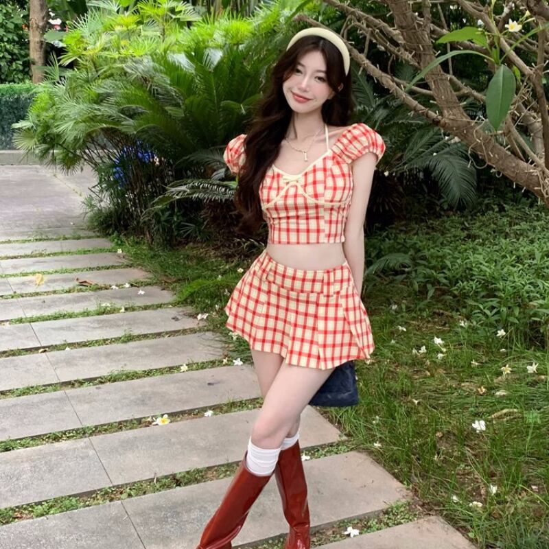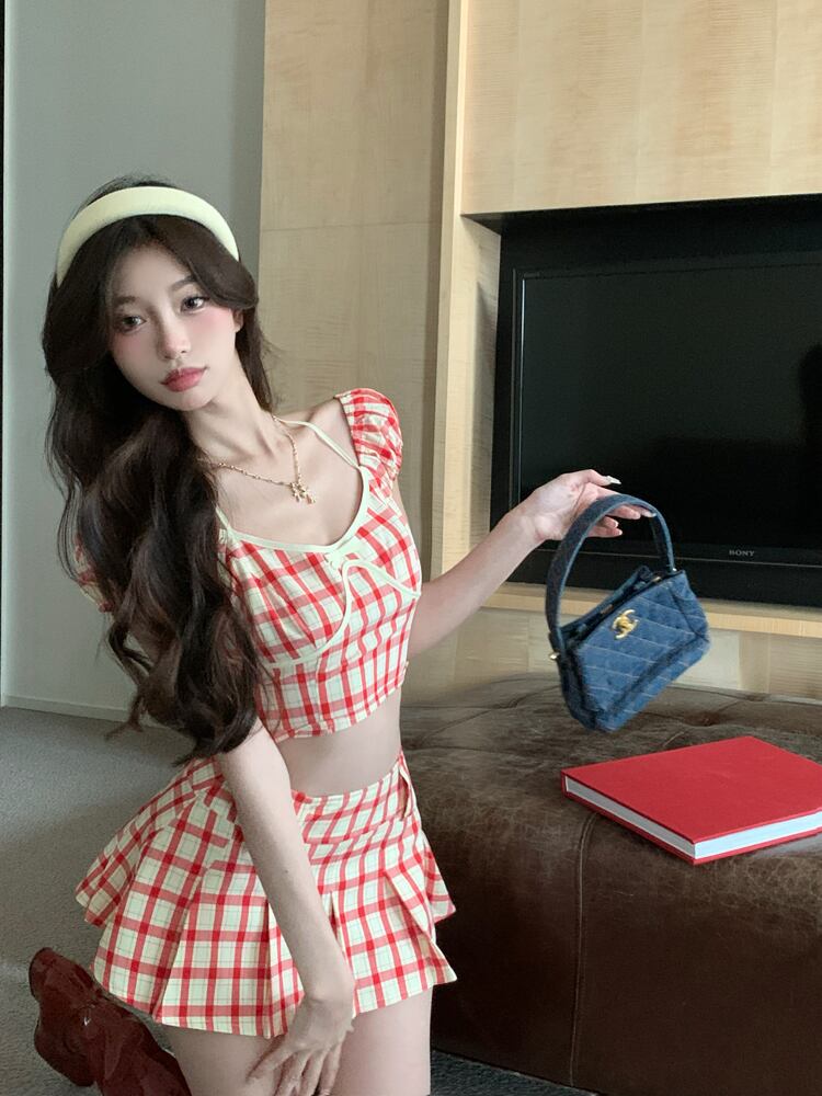 甘いホット女子夏セクシースーツ格子縞半袖シャツウエストショーツスカート 2 点セット服 大人ガーリー スウィート キュート カジュアル サマー 夏物 ブルマー