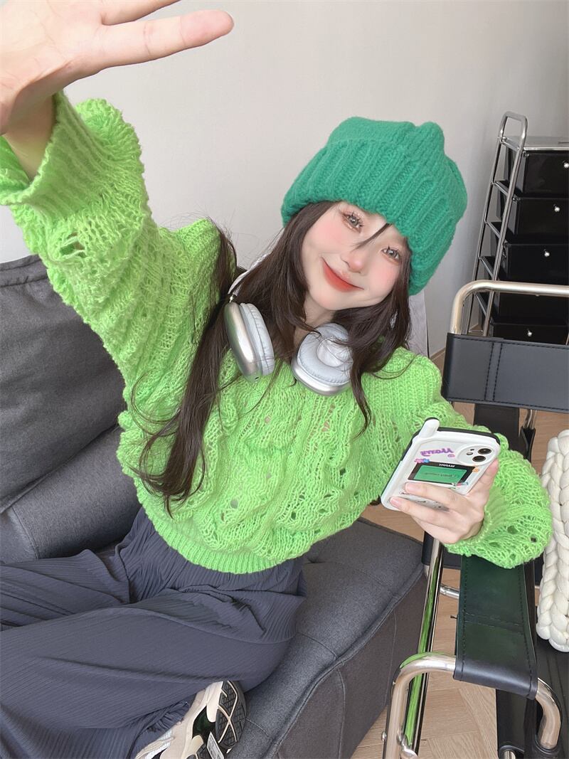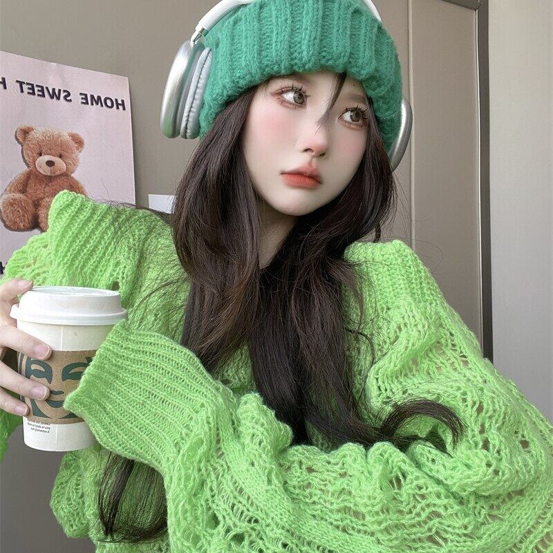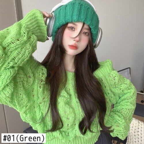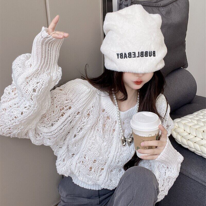 パフスリーブセーター中空アウトセータープレッピースタイルルーズフィット O ネックトップスニットレディースホワイトプルオーバー Oネック