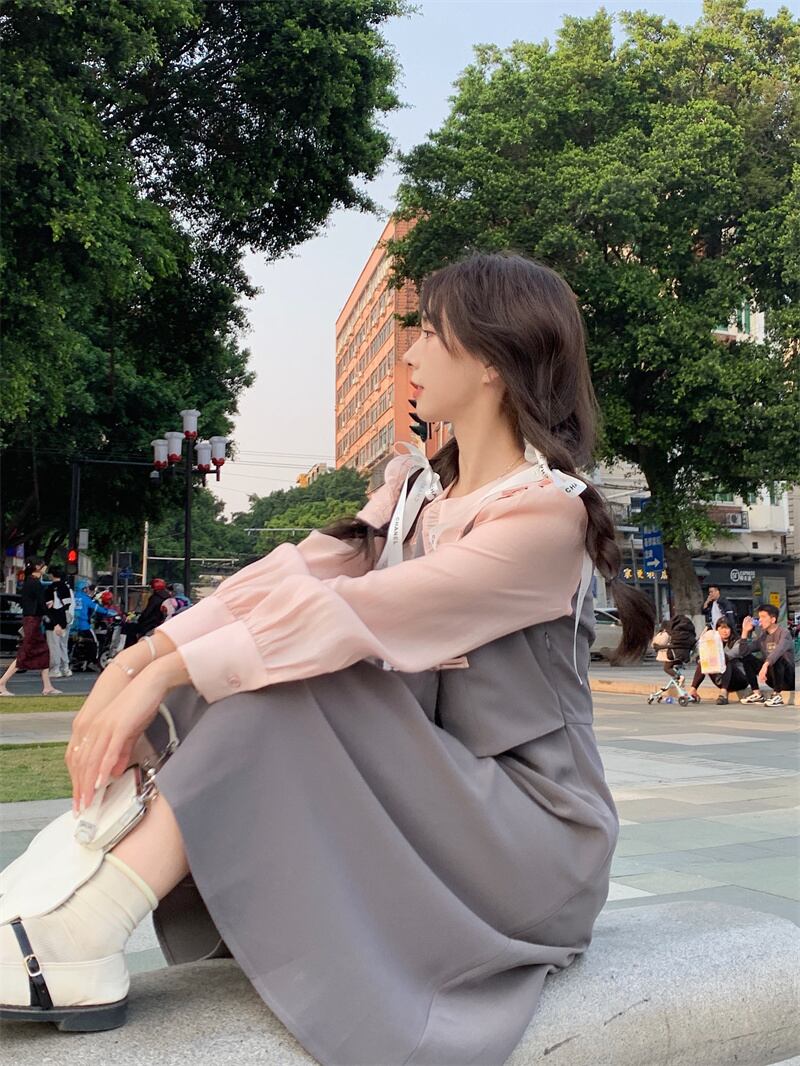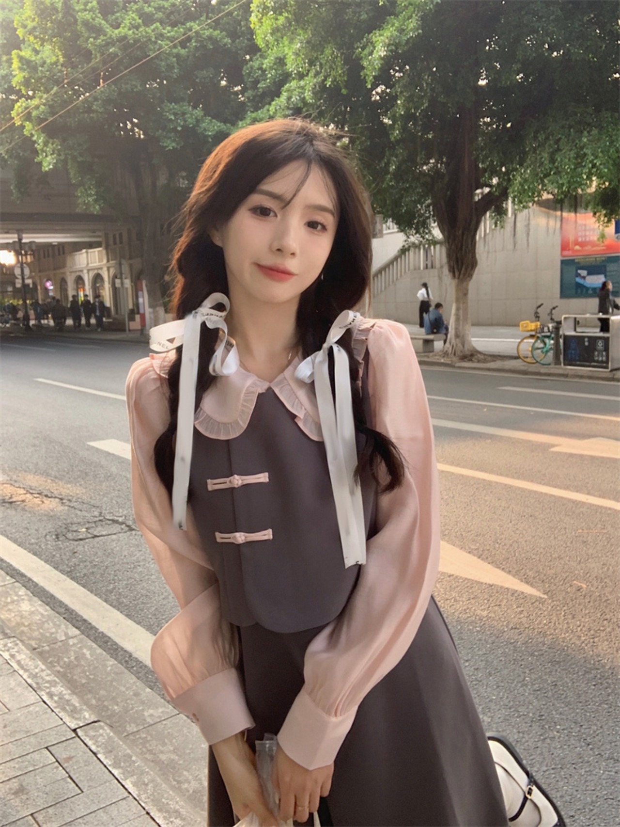 中国風ボタンピーターパンカラーフェイクツーピースドレス春ミッドレングススプライシング通勤ドレス スプリング 春物