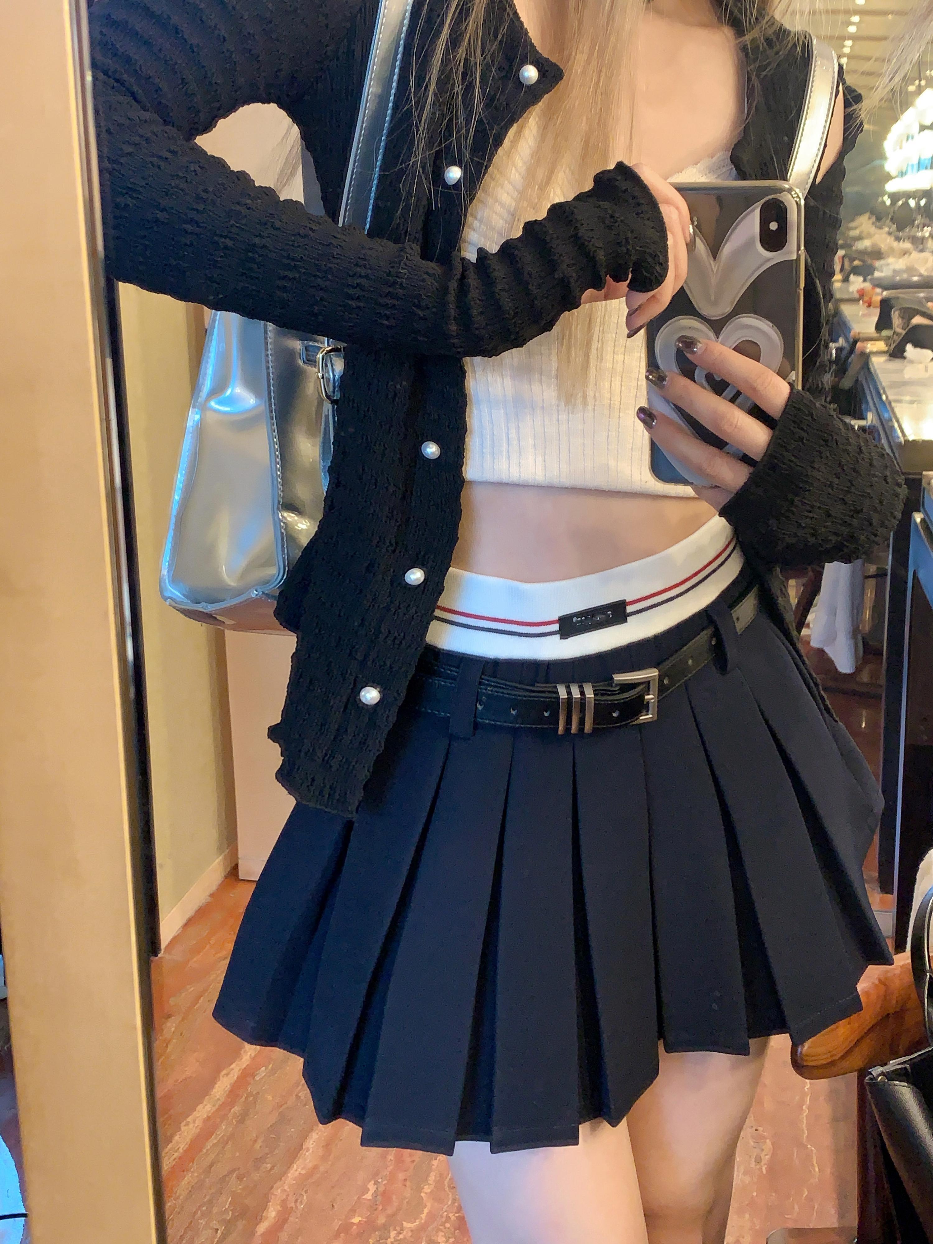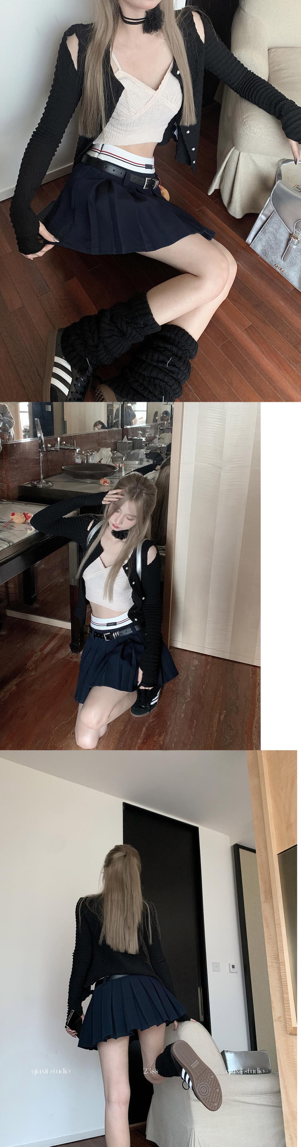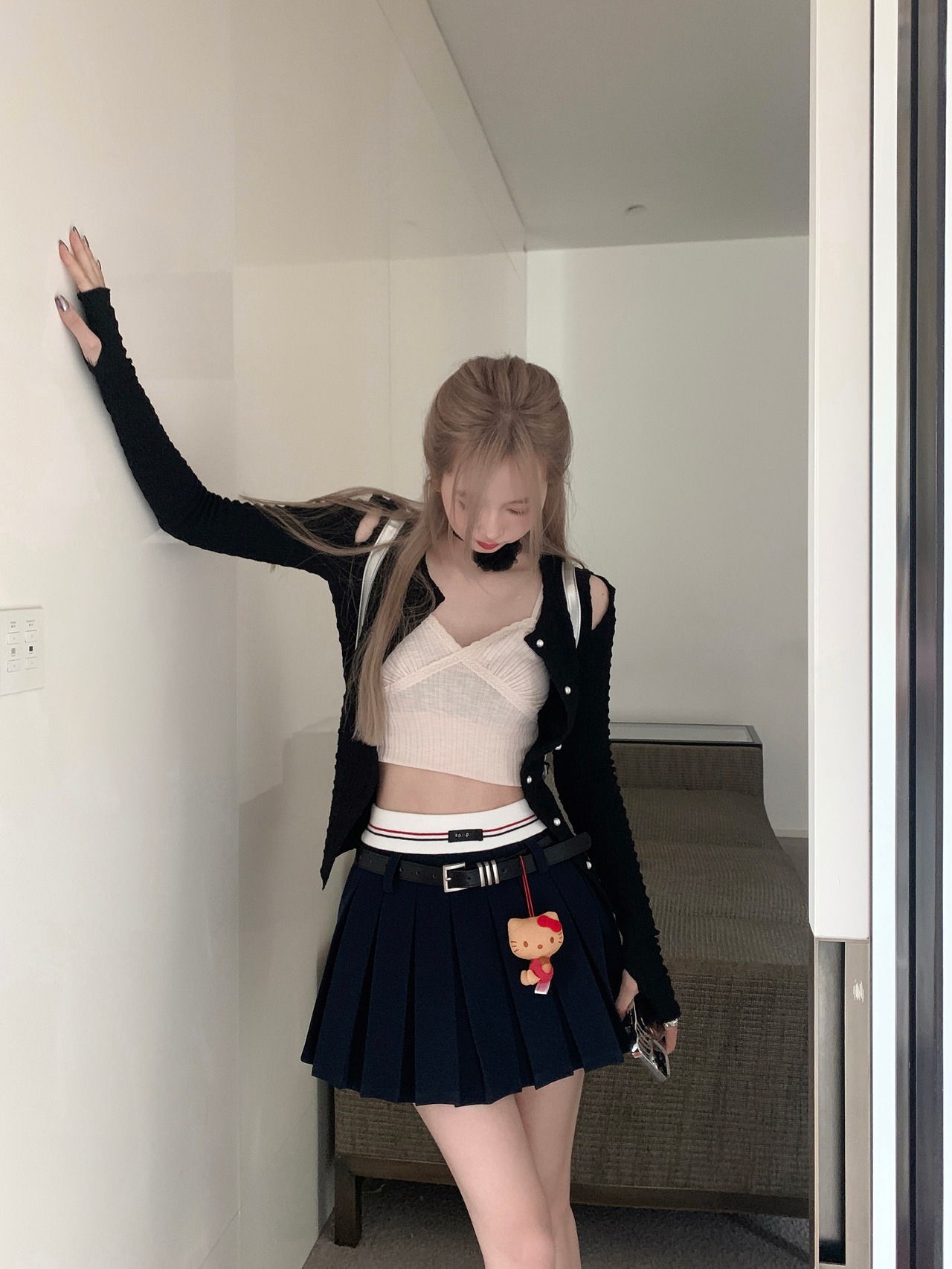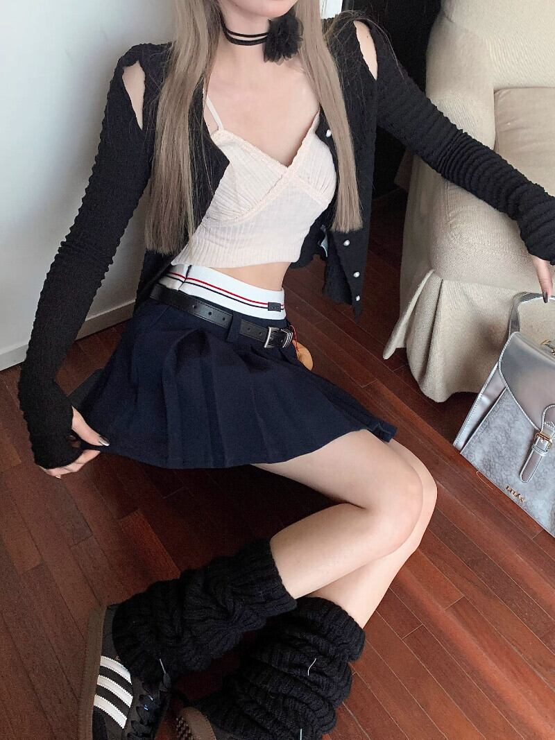 アメリカンホットガールズスーツ中空長袖カーディガン V ネックサスペンダートッププリーツミニスカート 3 点セット服 ロング Vネック