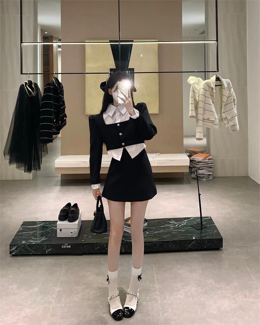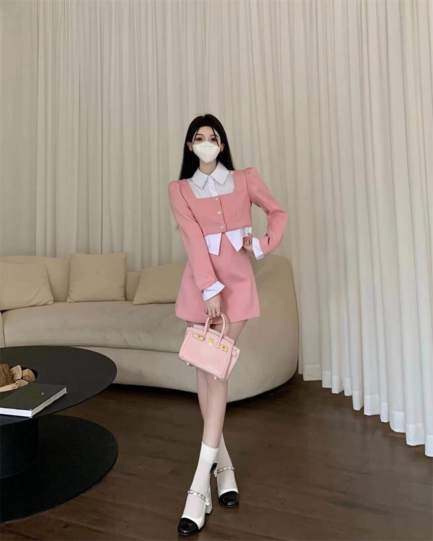 春スタイルスウィートガールスーツバブルスリーブスプライシングシャツトップウエストミニスカートツーピースセット服 大人ガーリー キュート カジュアル スプリング 春物