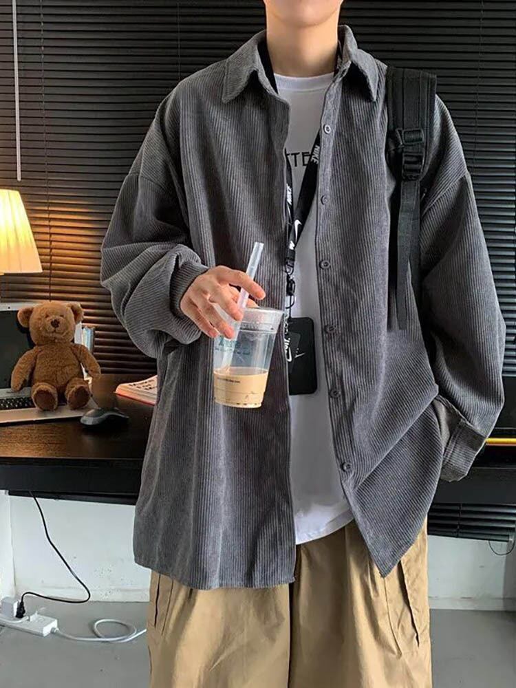 シャツ コーデュロイ長袖メンズ トップス ルーズ シャツボタン ブラウス男性秋ホワイト コットン トップ ロング オータム 秋物 ソリッドカラー