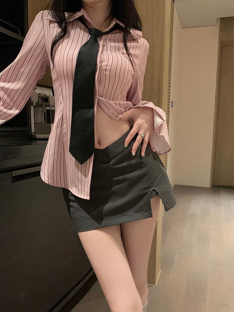 アメリカン プレッピー スタイル スーツホット ガール ストライプ シャツ スリム フィット ラップ ヒップ ショート スカート ショーツ 2 ピース セット服 ブルマー