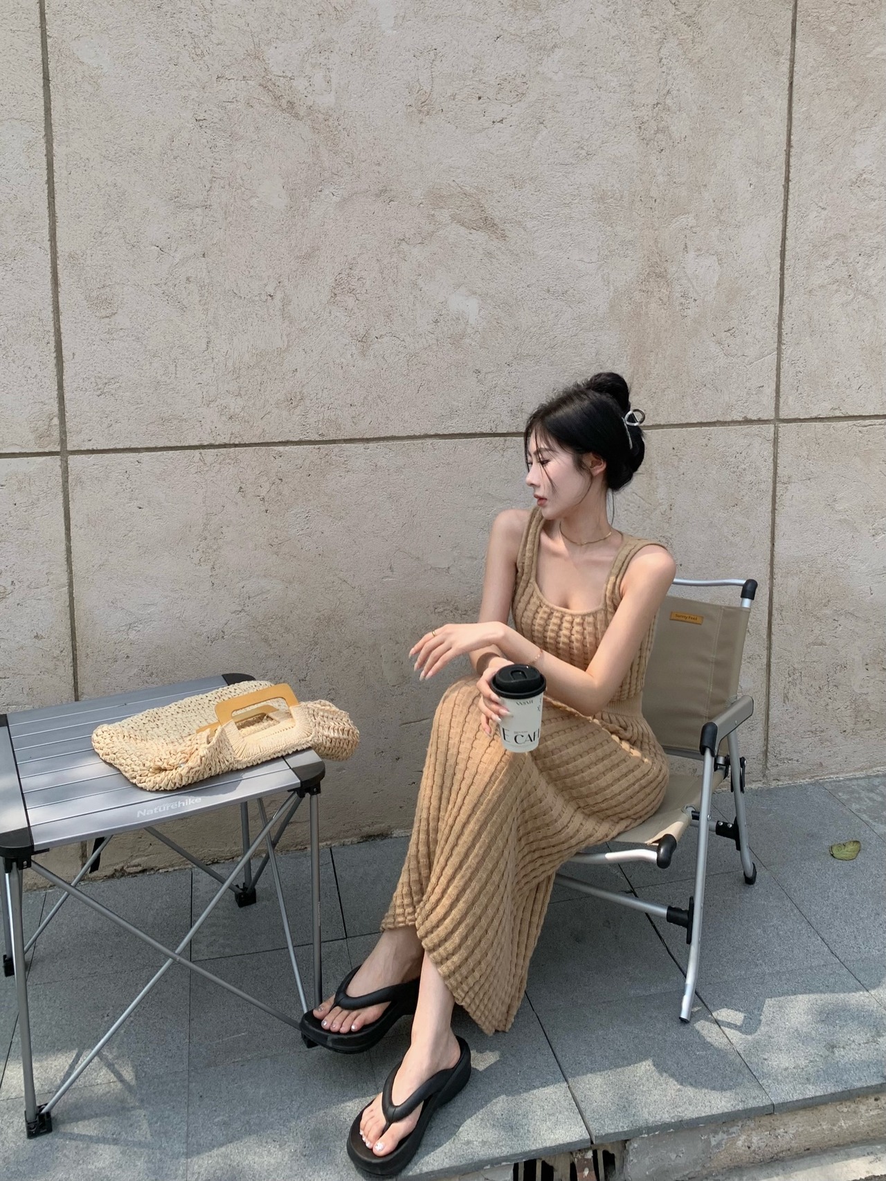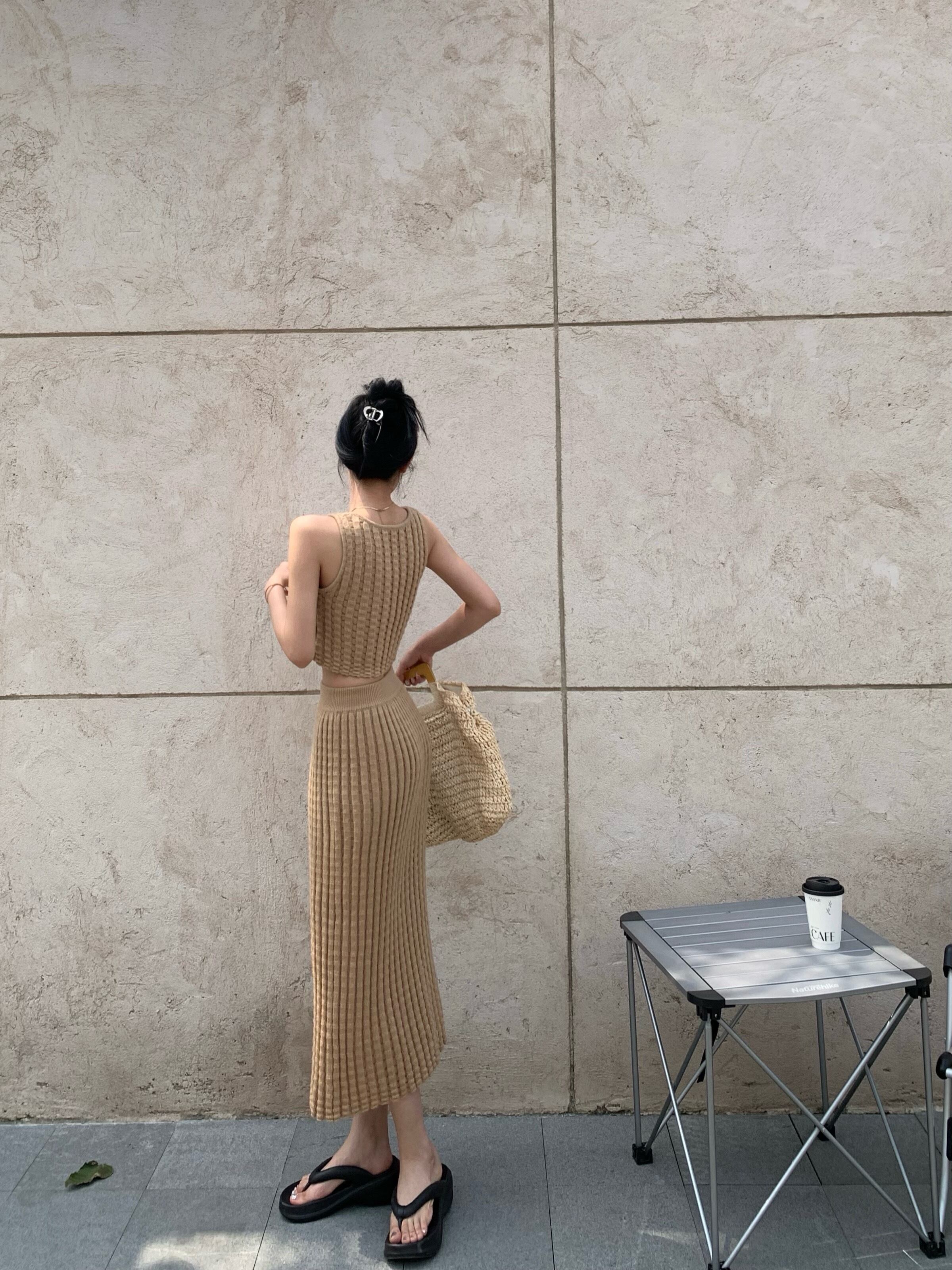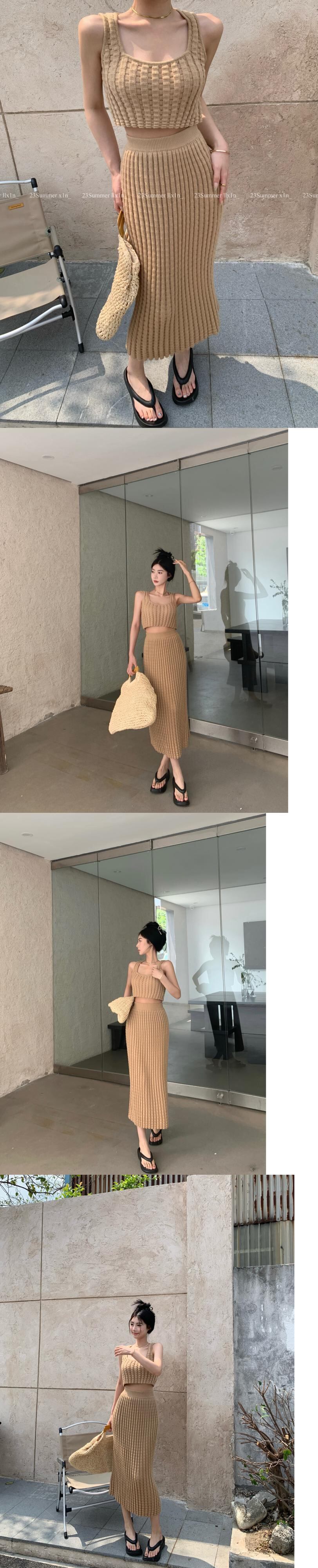 ホットガール夏ニットスーツピットストライプショートストラップトップウエストスリムフィットロングスカートツーピースセット服 サマー 夏物