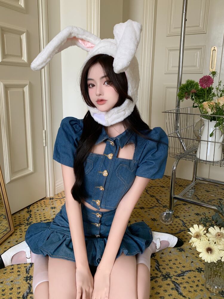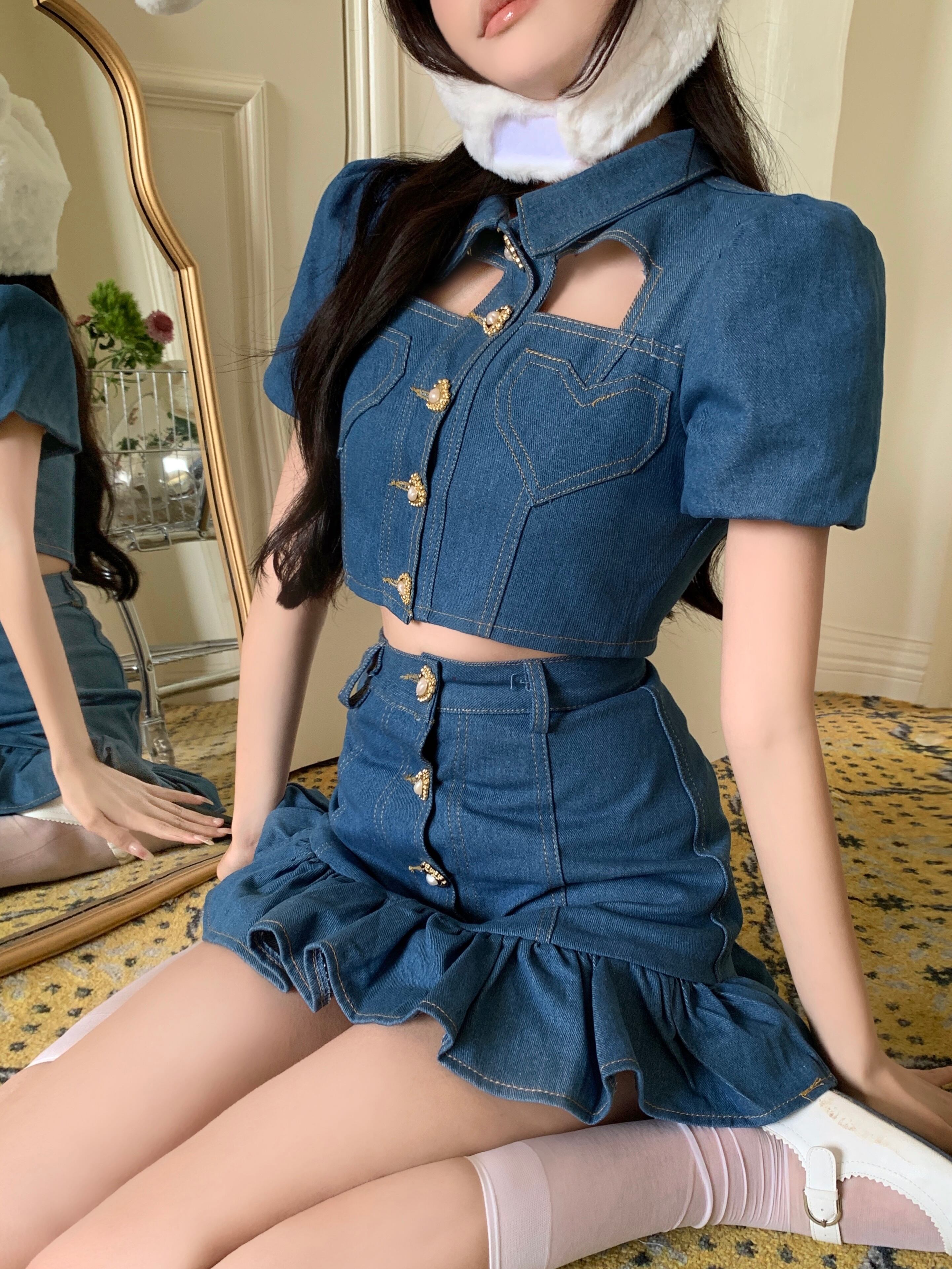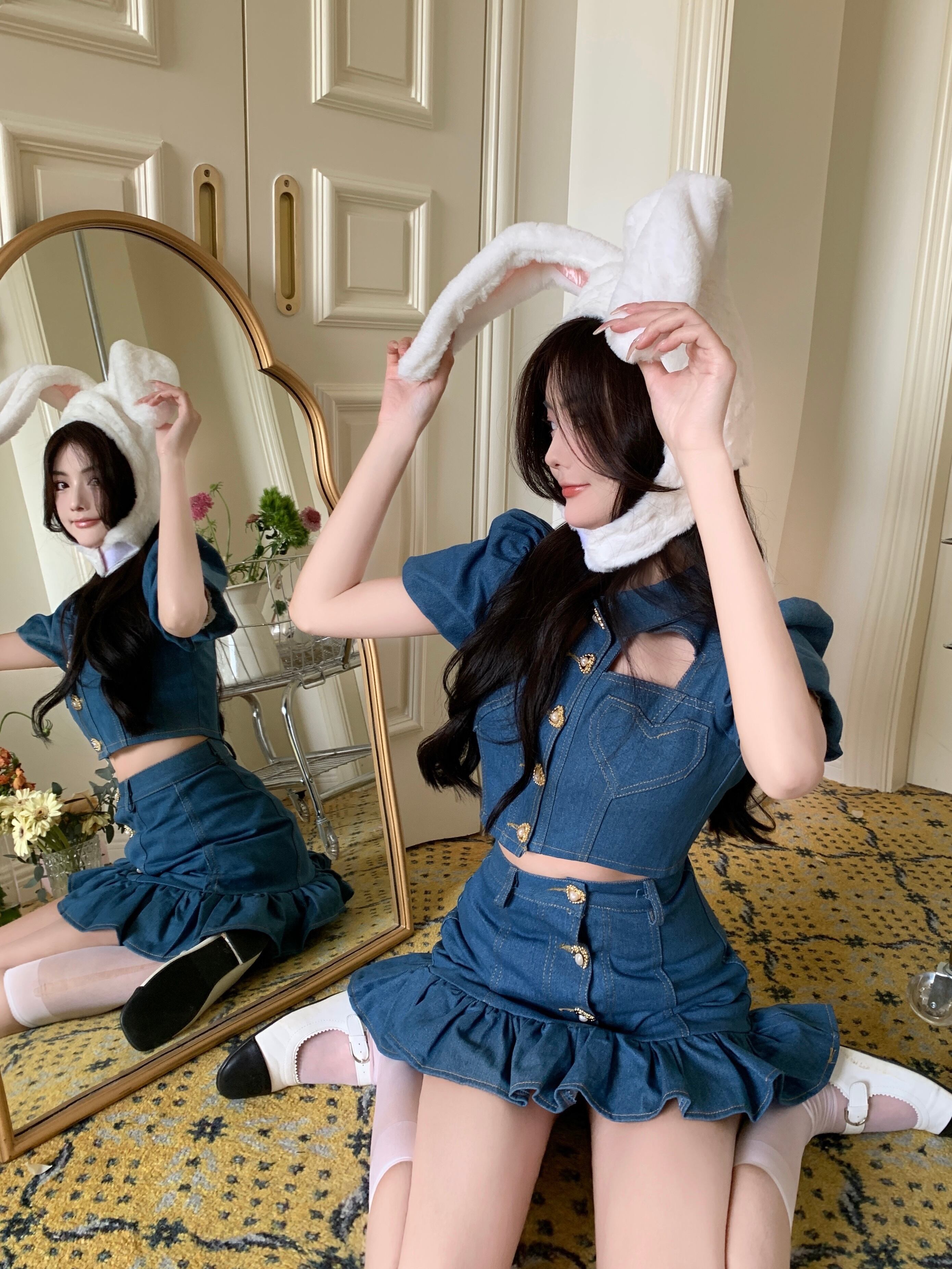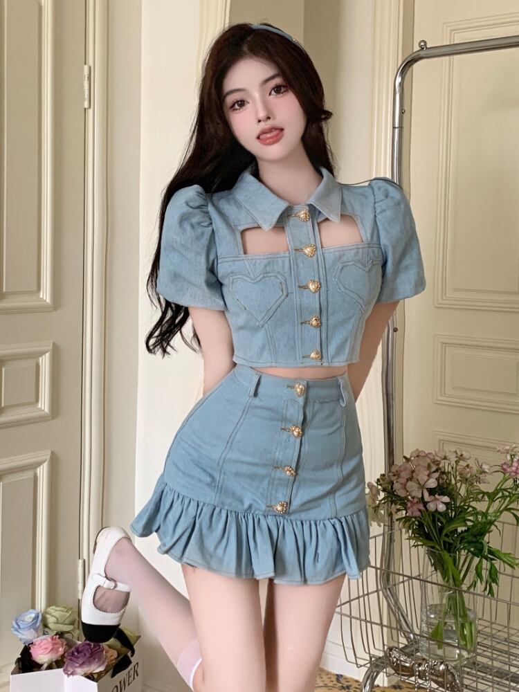 Gothiscyn ホットガールスーツスカートデニムトップスカートブルーツーピースセット夏パフスリーブトップス サマー 夏物