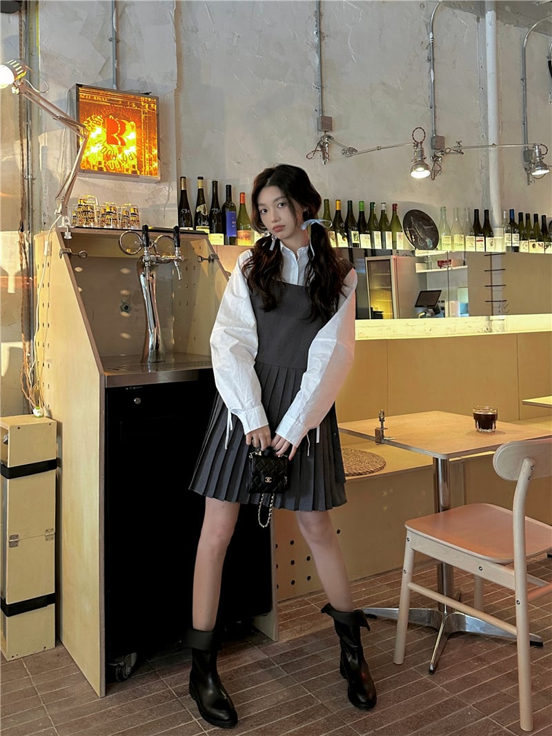スタイル通勤スーツストラッププリーツレースショートドレスランタンスリーブシャツ 2 点セット服